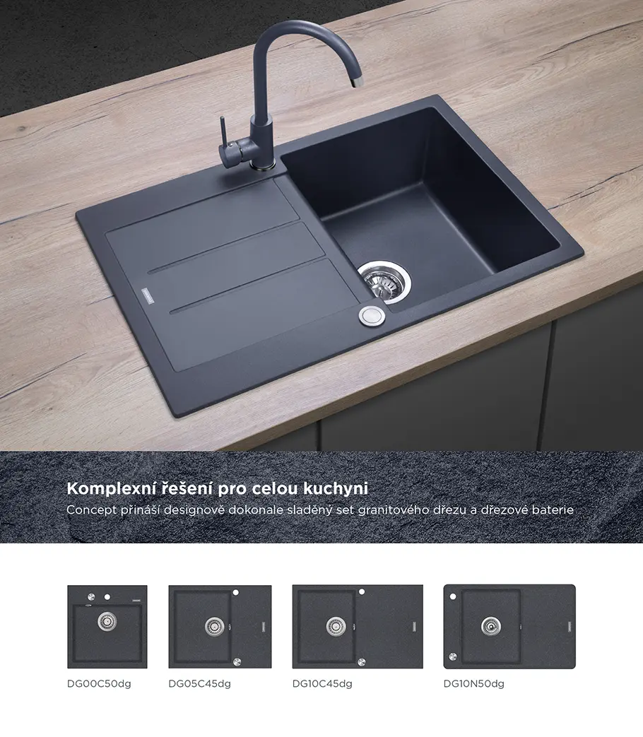 Dřezová baterie BDG3334dg je zpracována v jednoduchém a elegantním designu. Povrch baterie tvoří kvalitní barva s designem granitového povrchu v kombinaci s lesklými chromovými detaily. Dokonale ladí s tmavě šedými granitovými dřezy Concept. Tento model nabízí další 4 barevné varianty: černá (BDG3334bc), bílá (BDG3334wh), béžová (BDG3334be) a lesklá chromová (BDC3334).
