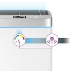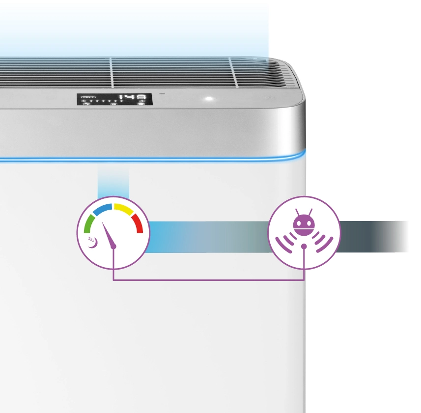 Čistička je opatřena citlivým senzorem znečištění, díky kterému v reálném čase vidíte míru polétavého prachu (PM2,5) v místnosti. Po spuštění pracuje v režimu SMART, který automaticky načte aktuální stav znečištění. Podle zjištěných hodnot si sama nastaví optimální rychlost čištění. Přesná hodnota se zobrazí na přehledném LED displeji. Kvalitu vzduchu můžete vizuálně kontrolovat pomocí barevného podsvícení, které se mění v závislosti na míře znečištění: zelená = vynikající kvalita ovzduší (do 80 PM2,5) • modrá = mírné znečištění (81 – 120 PM2,5) • žlutá = střední znečištění (121 – 160 PM2,5) • červená = vysoké znečištění (161 PM2,5 a více)