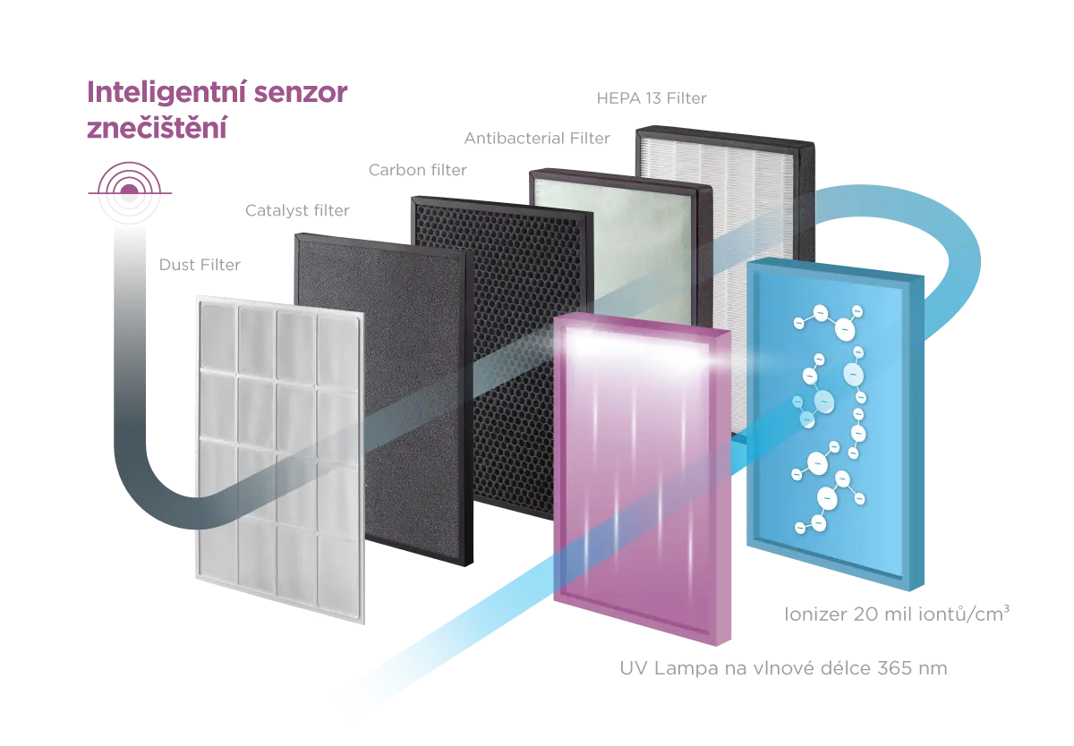 Filtrace je nejdůležitější část čističky, která rozhoduje o výsledné kvalitě vzduchu. Model CA3000 je vybaven 7násobným filtračním systémem, který zachytí znečištěné látky a zamezí jejich dalšímu šíření. Dokáže odstranit až 99,9 % škodlivin obsažených ve vzduchu. Každá jednotlivá filtrační vrstva zachytí specifické druhy nečistot a vzájemnou součinností je dosaženo dokonale čistého ovzduší ve vaší domácnosti. Díky pokročilé technologii si sama pohlídá aktuální stav filtrů a upozorní na nutnost jejich výměny.