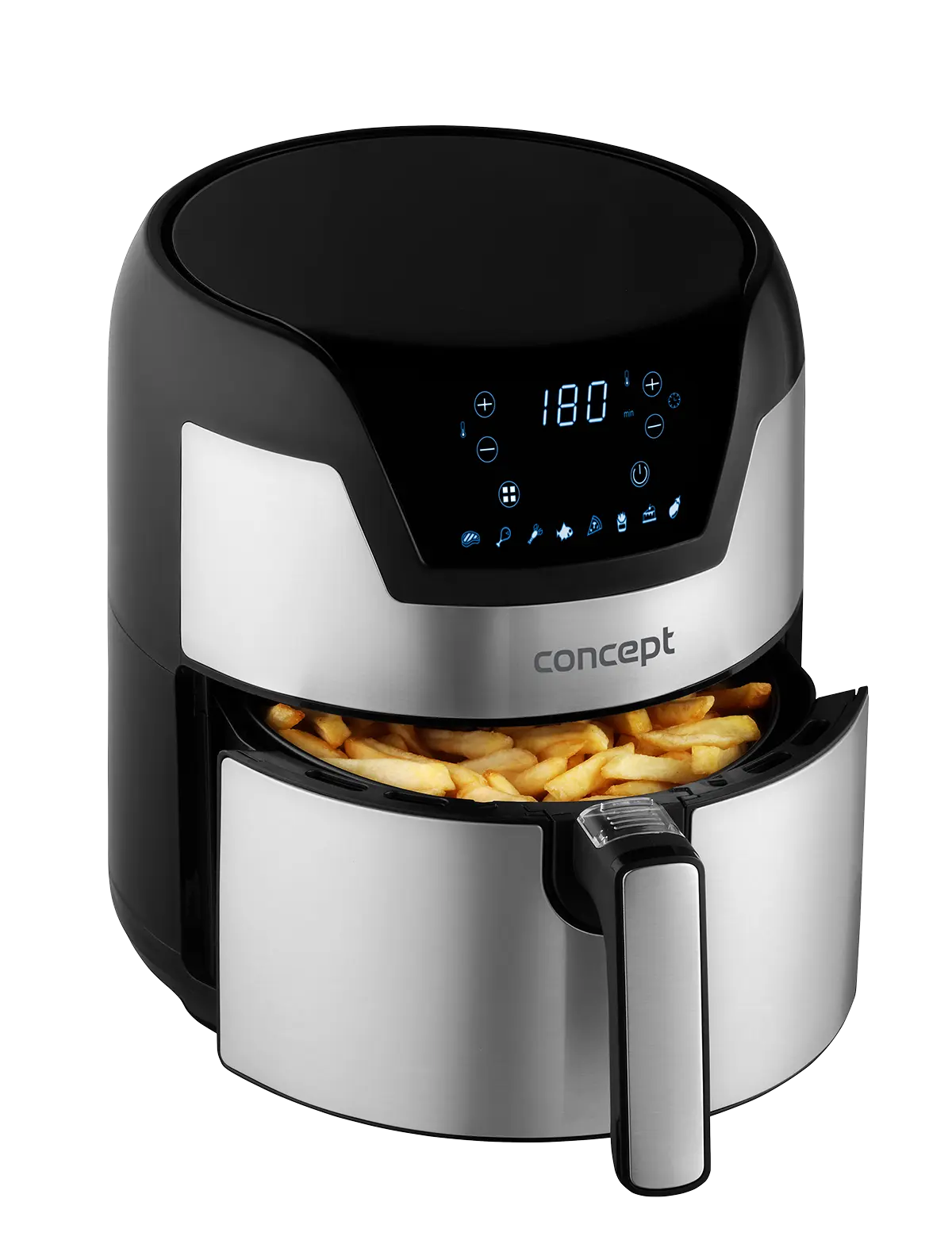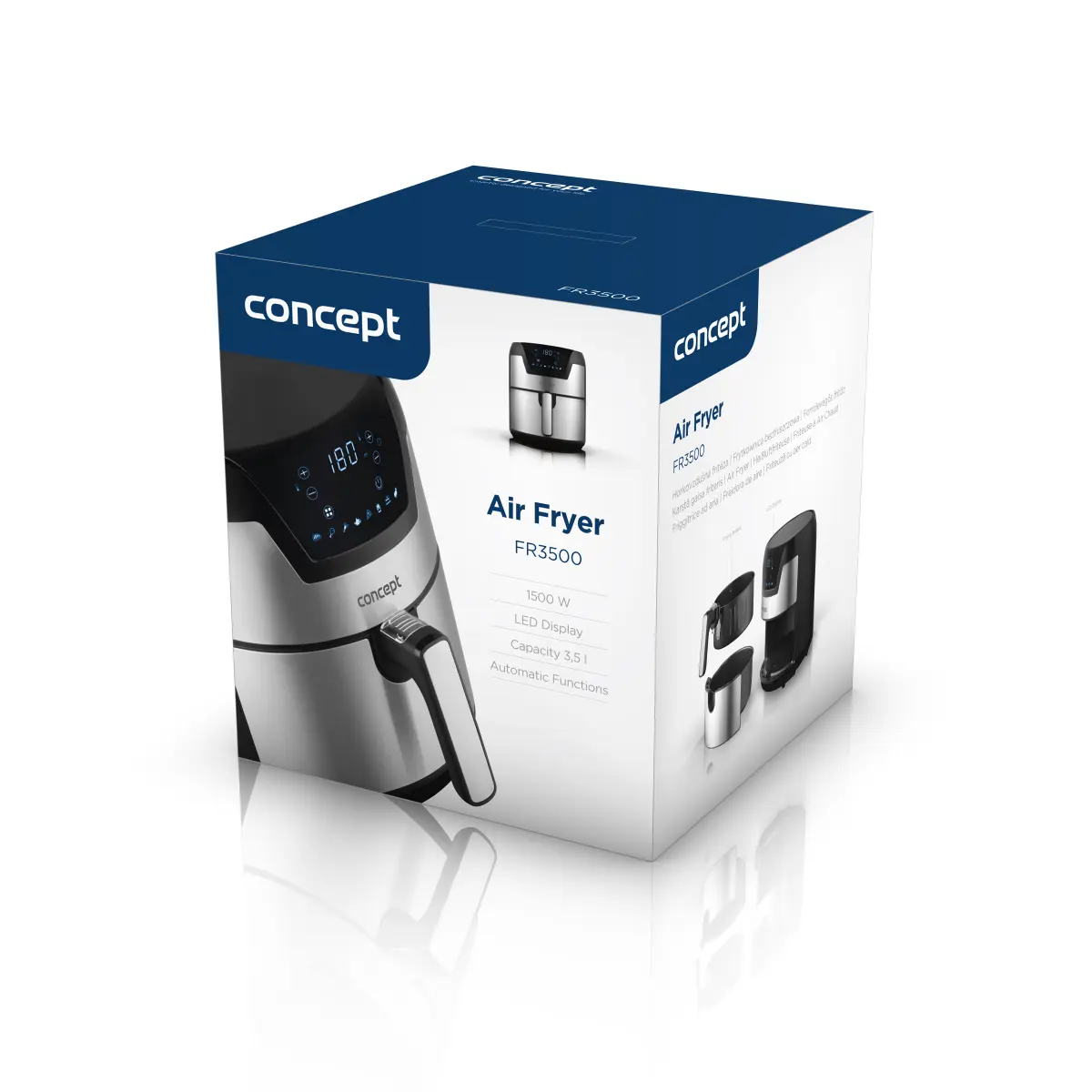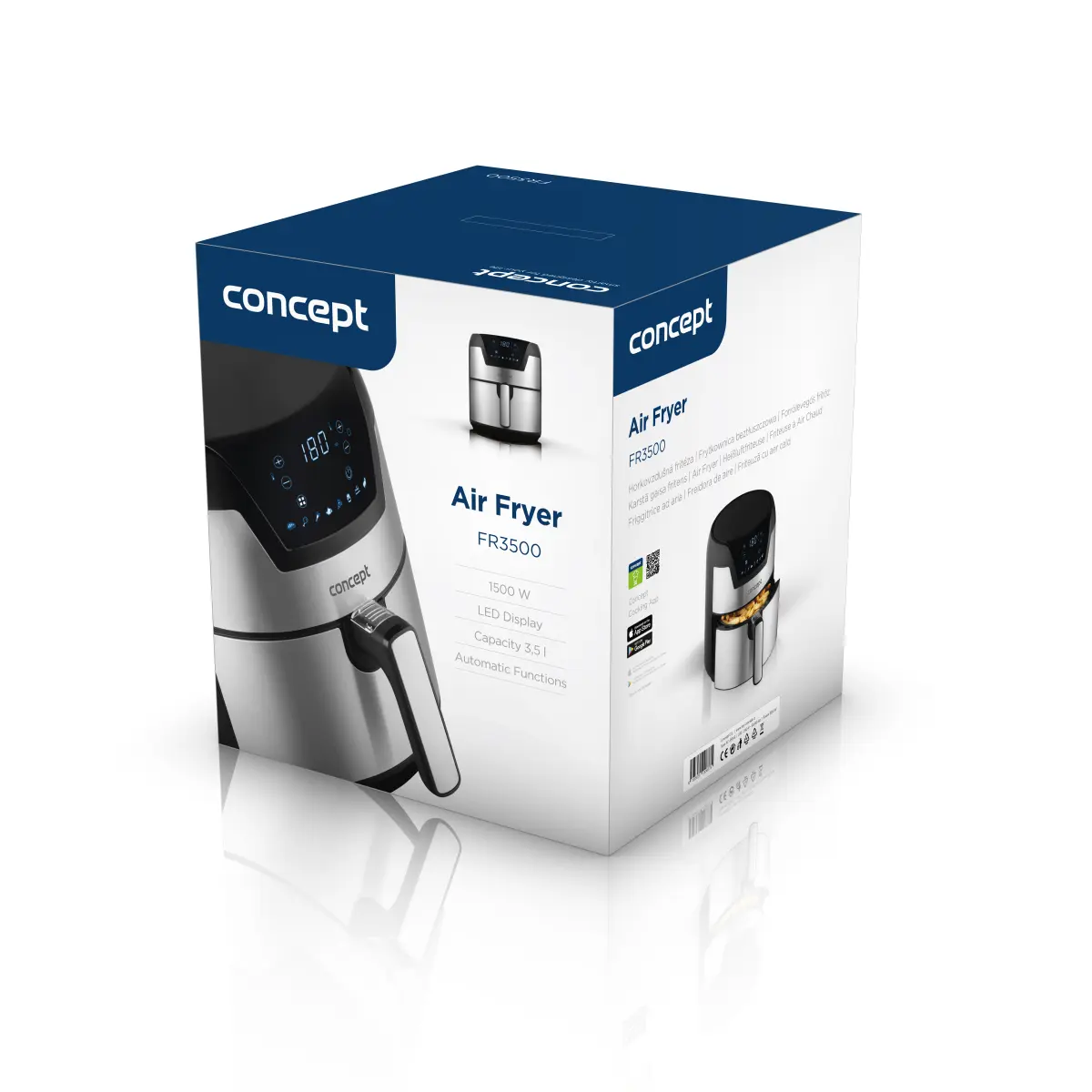 <b><p>Poškozený vnější obalový materiál. Výrobek je nový a nepoužívaný, ve 100% technickém a funkčním stavu s plnou zárukou 24 měsíců. Na tuto položku se nevztahují slevové akce a dárky.</p> </b> Horkovzdušná fritéza Concept FR3500 představuje zdravý způsob smažení. Disponuje nádobou o objemu 4,3 l a 8 přednastavenými programy. Můžete v ní zdravě smažit, péct a grilovat.