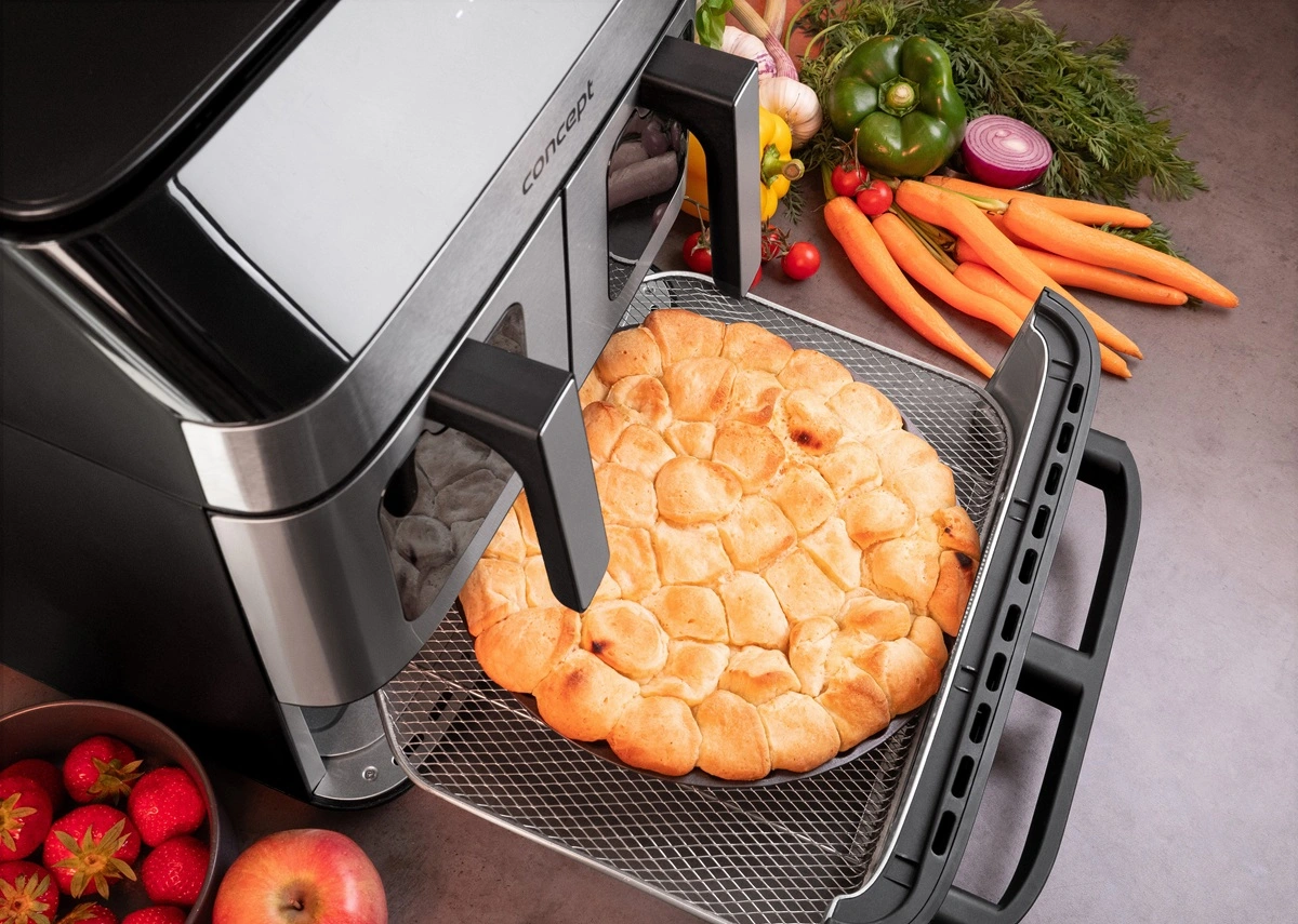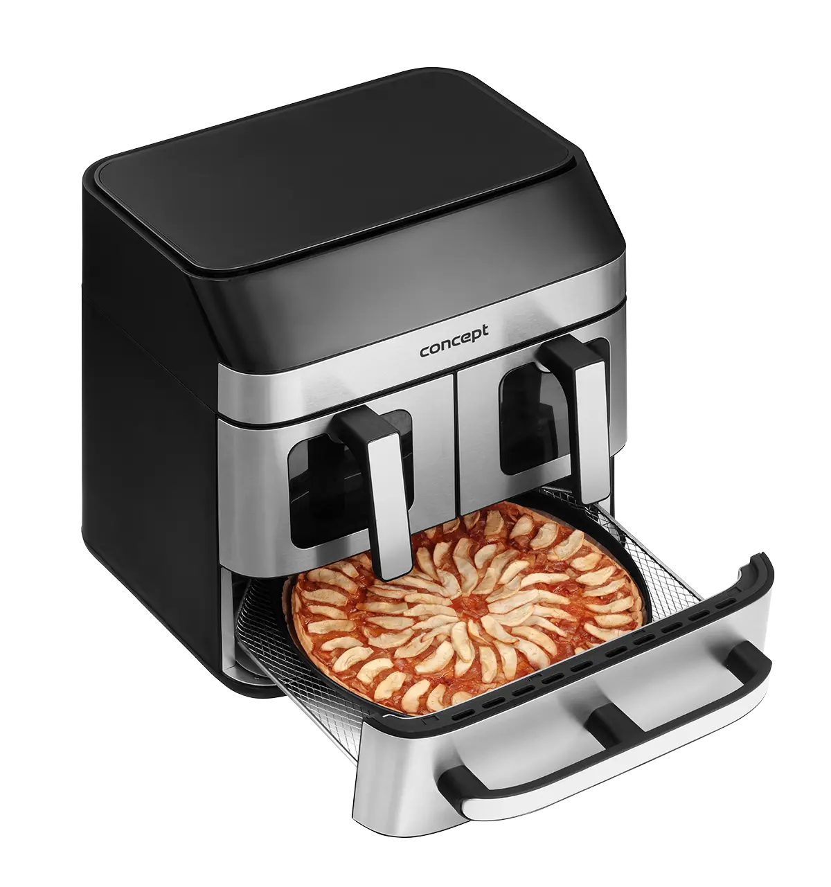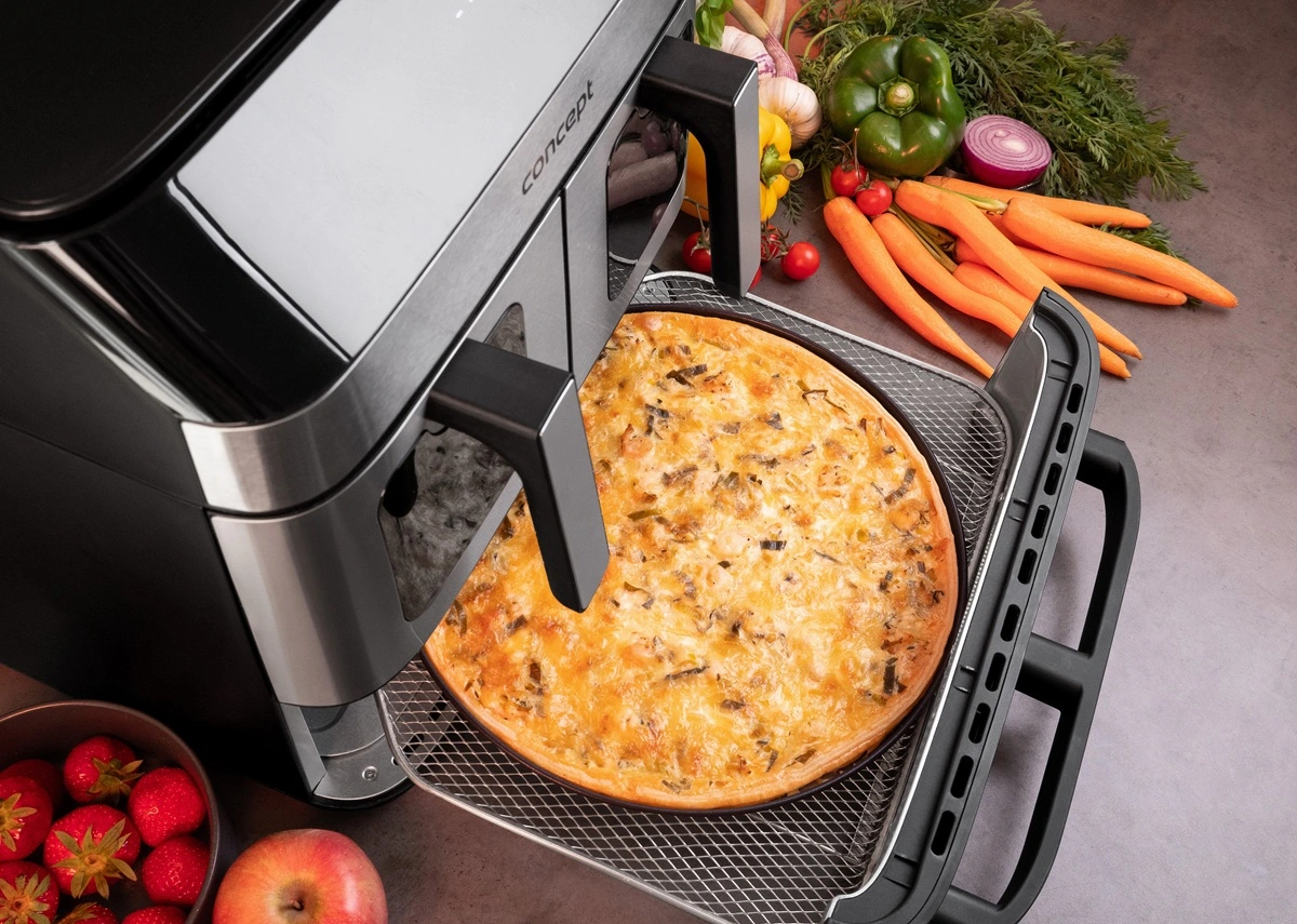 S horkovzdušnou fritézou 18,5 l PIZZA TRIO Concept FR9000 se dvěma nezávislými koši a multifunkční pečicí zásuvkou připravíte kompletní menu najednou. Zatímco ve fritovacích koších připravíte hlavní chod a přílohu, v multifunkční pečicí zásuvce upečete koláč k odpolední kávě. Tohle je vaření nové generace – rychlé, chutné, efektivní a bez kompromisů.