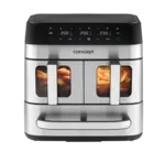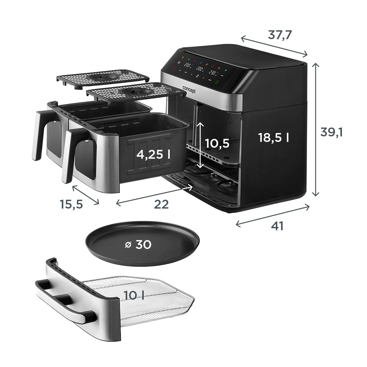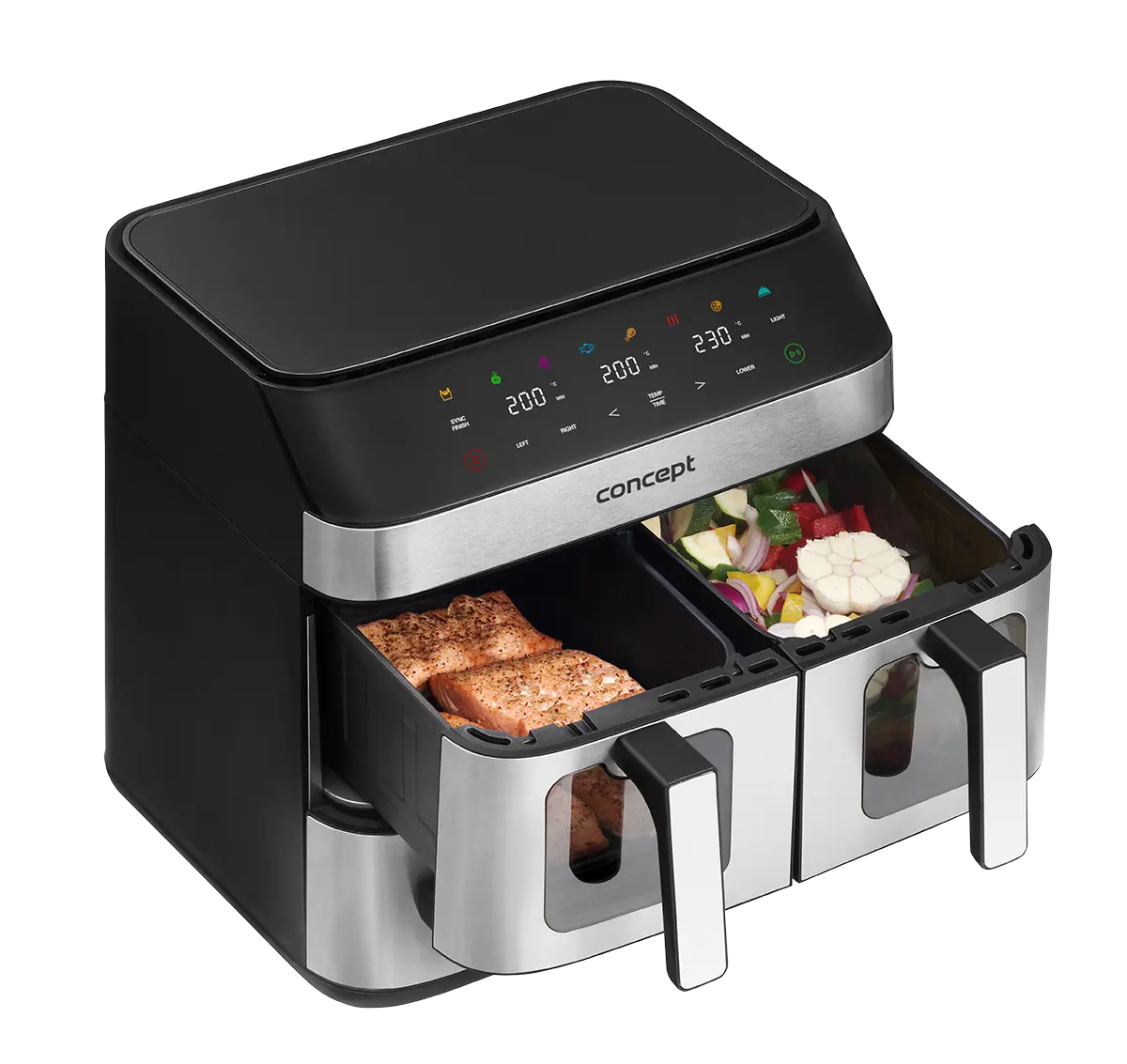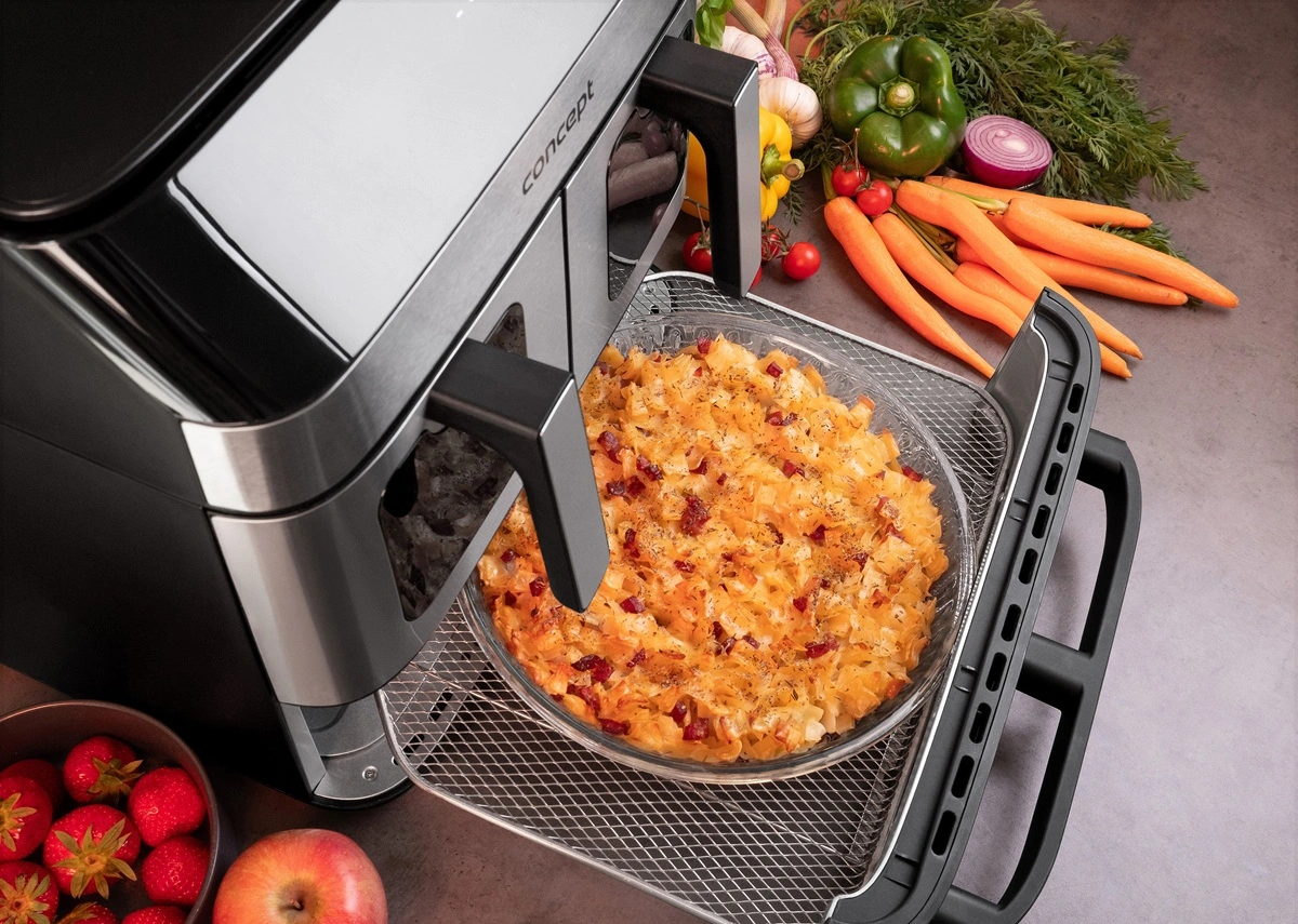 S horkovzdušnou fritézou 18,5 l PIZZA TRIO Concept FR9000 se dvěma nezávislými koši a multifunkční pečicí zásuvkou připravíte kompletní menu najednou. Zatímco ve fritovacích koších připravíte hlavní chod a přílohu, v multifunkční pečicí zásuvce upečete koláč k odpolední kávě. Tohle je vaření nové generace – rychlé, chutné, efektivní a bez kompromisů.