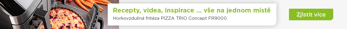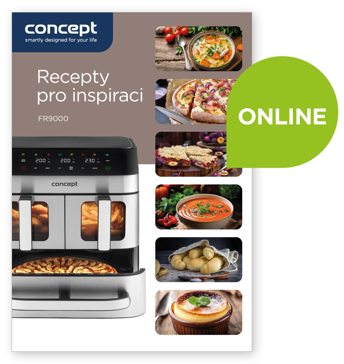 Horkovzdušná fritéza PIZZA TRIO Concept FR9000 nabízí přístup k praktické >>online kuchařce<<, která přináší inspiraci pro každodenní vaření. Obsahuje ověřené recepty z české i zahraniční kuchyně, které jsou přehledně zpracované, snadno srozumitelné a optimalizované přímo pro přípravu ve fritéze.