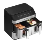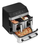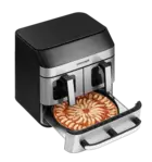 Dva samostatné fritovací koše o objemu 4,25 litru umožňují současnou přípravu dvou různých jídel – například hranolků a kuřete – bez vzájemného přenášení chutí. Díky funkci synchronizace pečení se i pokrmy s odlišnou délkou přípravy dokončí ve stejný čas. Výsledkem je úspora času, větší komfort a jistota, že celé menu bude servírováno optimálně teplé. Koše lze používat nezávisle nebo v kombinaci s multifunkční pečicí zásuvkou.