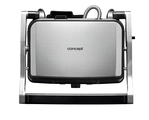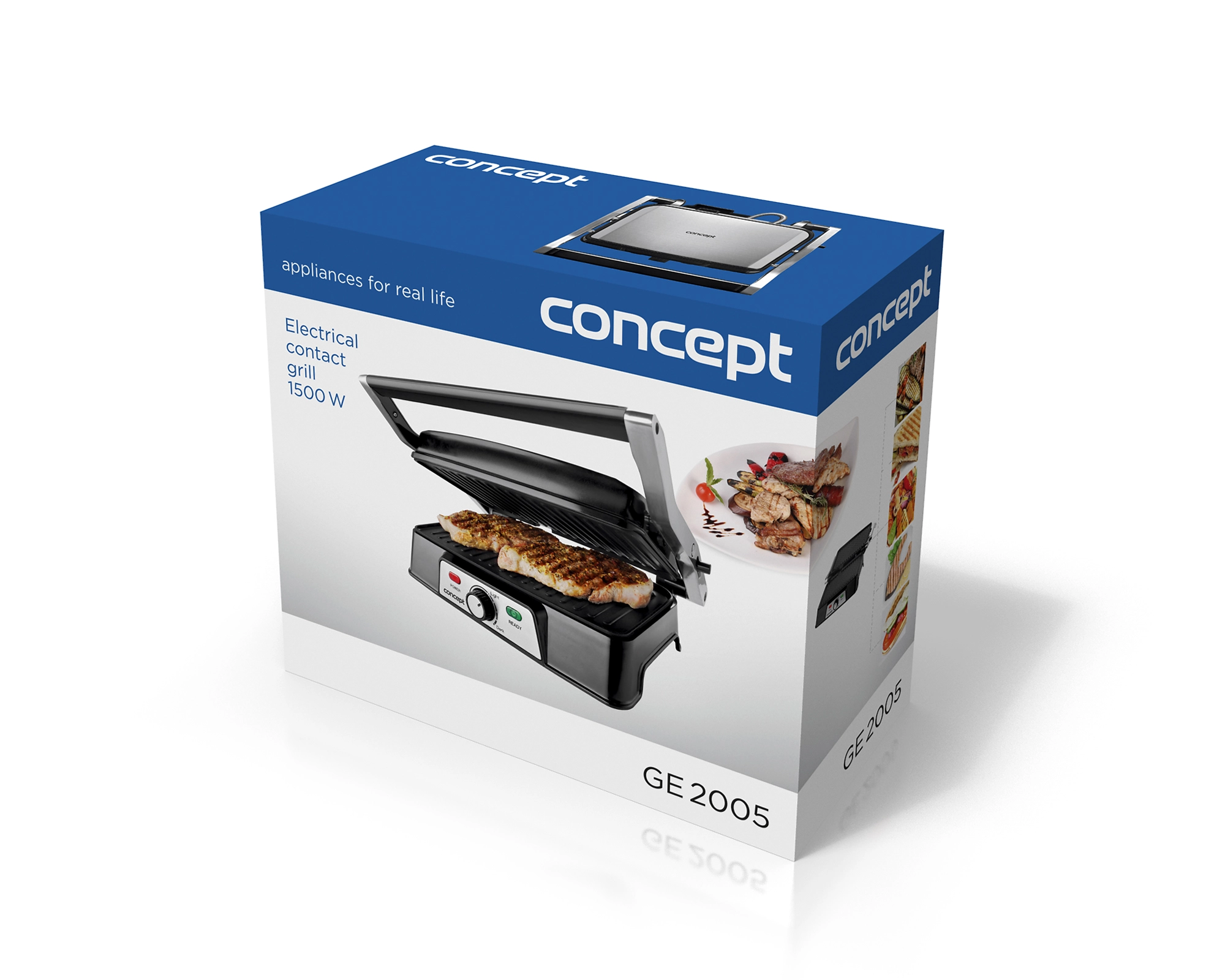 <b><p>Poškozený vnější obalový materiál. Výrobek je nový a nepoužívaný, ve 100% technickém a funkčním stavu s plnou zárukou 24 měsíců. Na tuto položku se nevztahují slevové akce a dárky.</p> </b> Kontaktní panini gril Concept GE2005 s příkonem 1500 W je všestranný pomocník, který vám ulehčí práci v kuchyni. Nabízí možnost BBQ grilování na rozevřených deskách a je vybaven regulátorem teploty.