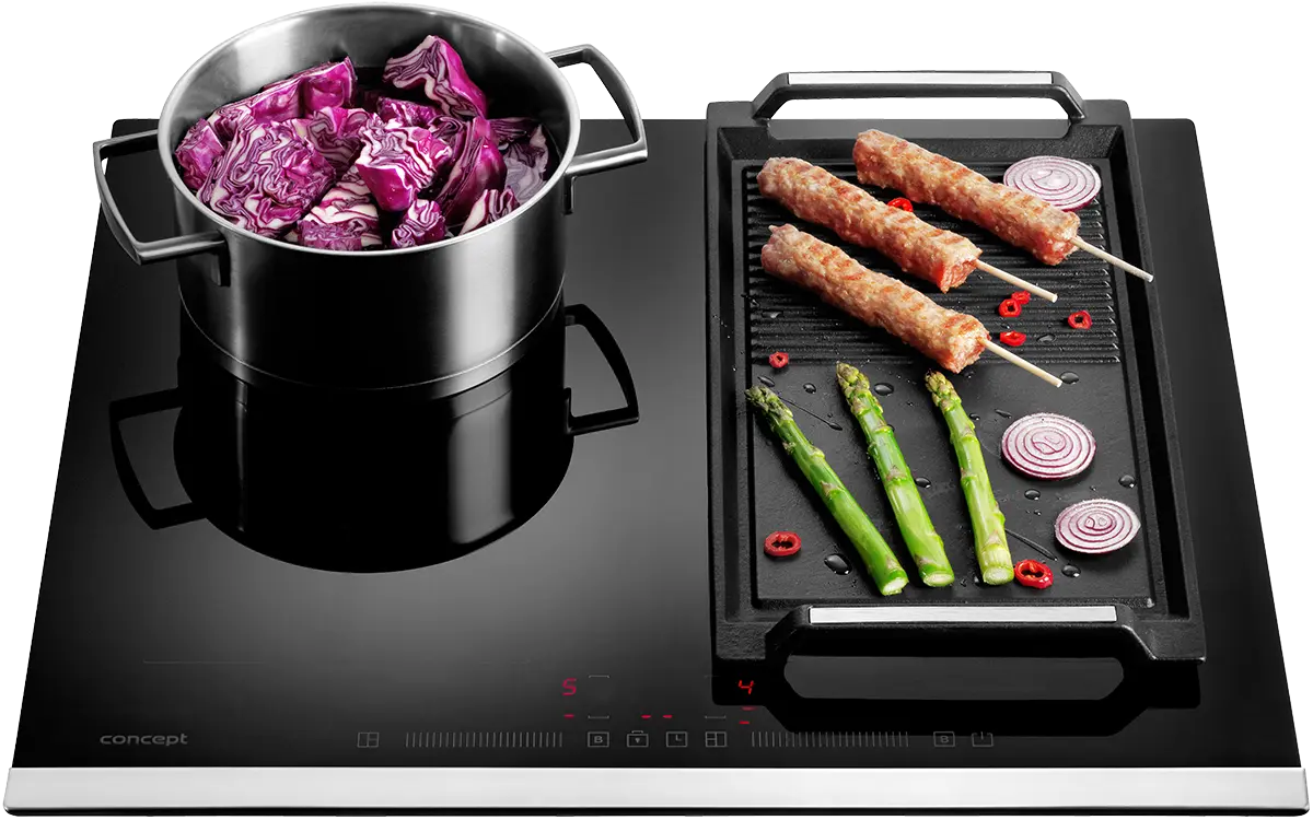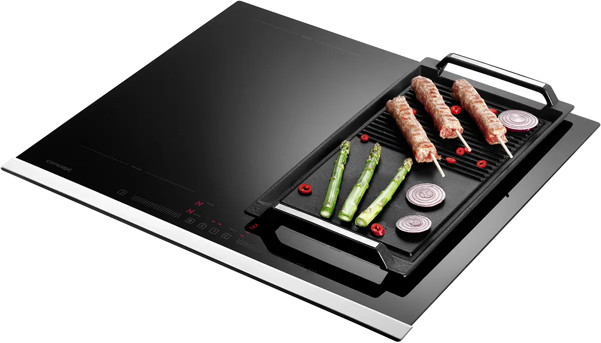 Grilovací deska Concept GD455 slouží ke grilování na indukční varné desce s flexi nebo bridge zónou. Je vyrobená z litiny, která rovnoměrně rozvádí teplo, je vysoce odolná a má nepřilnavý povrch. Deska je rozdělena na hladkou a žebrovanou část, takže na ní ugrilujete vše, na co si vzpomenete.