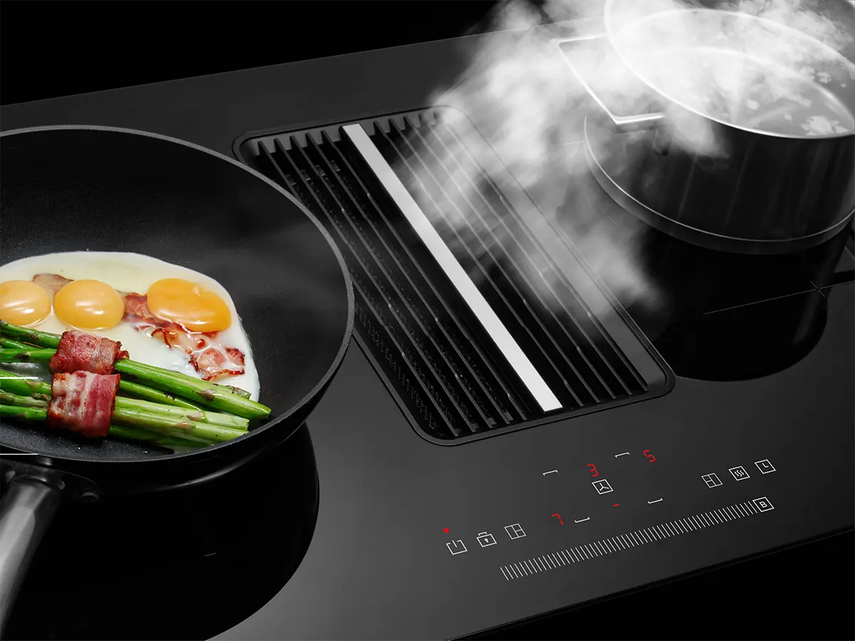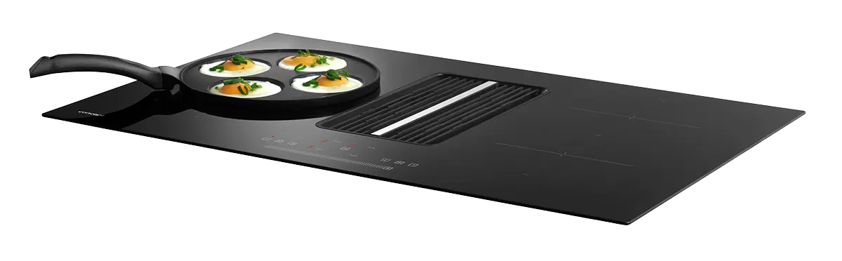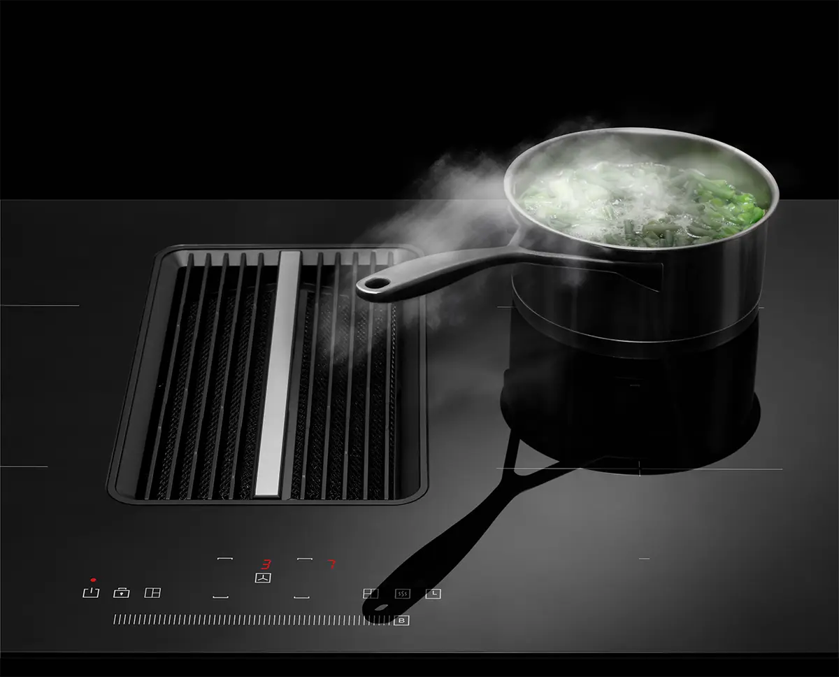 Velkou předností varné desky IDV6083bc Cook&Flow je vzájemná komunikace mezi varnou a odsávací zónou. Díky funkci Hob2Hood se odsavač automaticky sepne se začátkem vaření a přizpůsobí výkon odsávání. Po ukončení vaření se aktivuje funkce Fresh air, která zajistí odtah zbytkových par po ukončení vaření.
