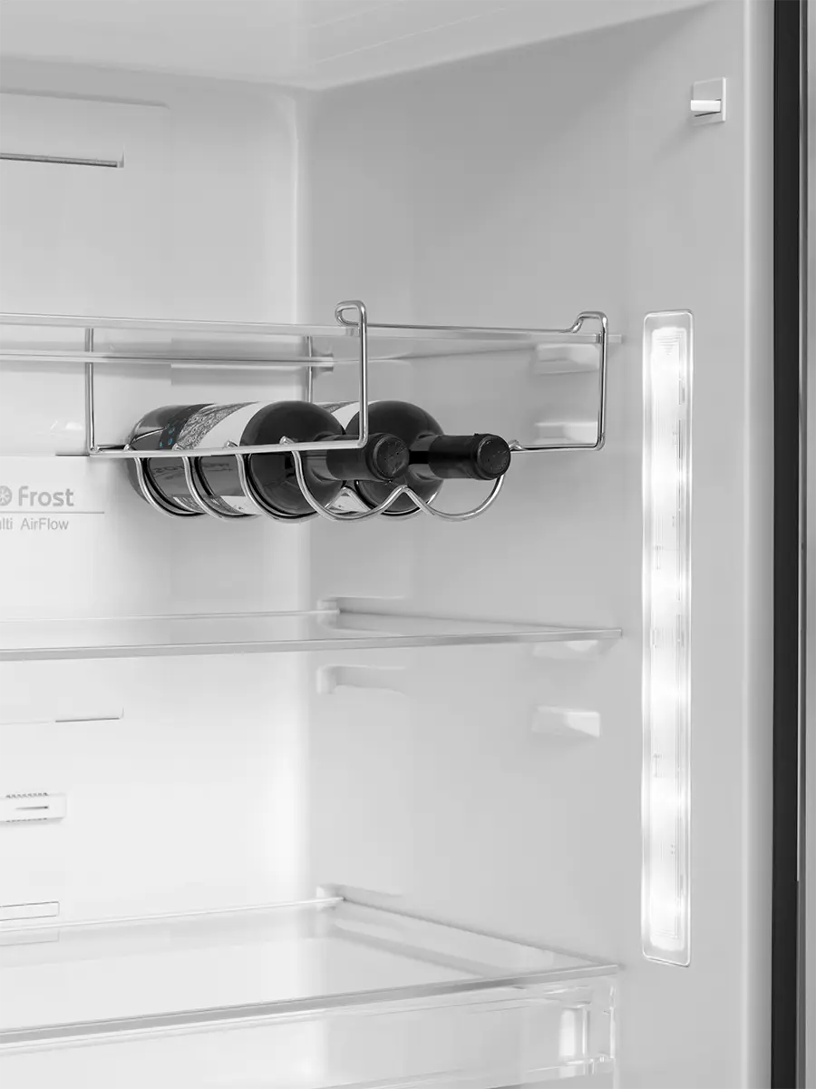 Součástí lednice je vyjímatelný držák na víno, který snadno připevníte kamkoliv na spodní stranu police. Nabízí úsporné, a hlavně bezpečné chlazení vína a dalších oblíbených nápojů.