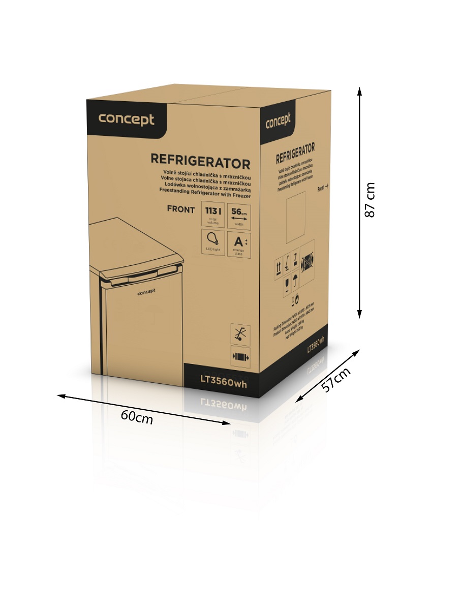 Volně stojící lednice s mrazákem Concept LT3560wh v bílém designu nabízí celkovou kapacitu 113 l, stranově zaměnitelné otevírání dveří, hlučnost pouhých 39 dB a velmi úsporný provoz.