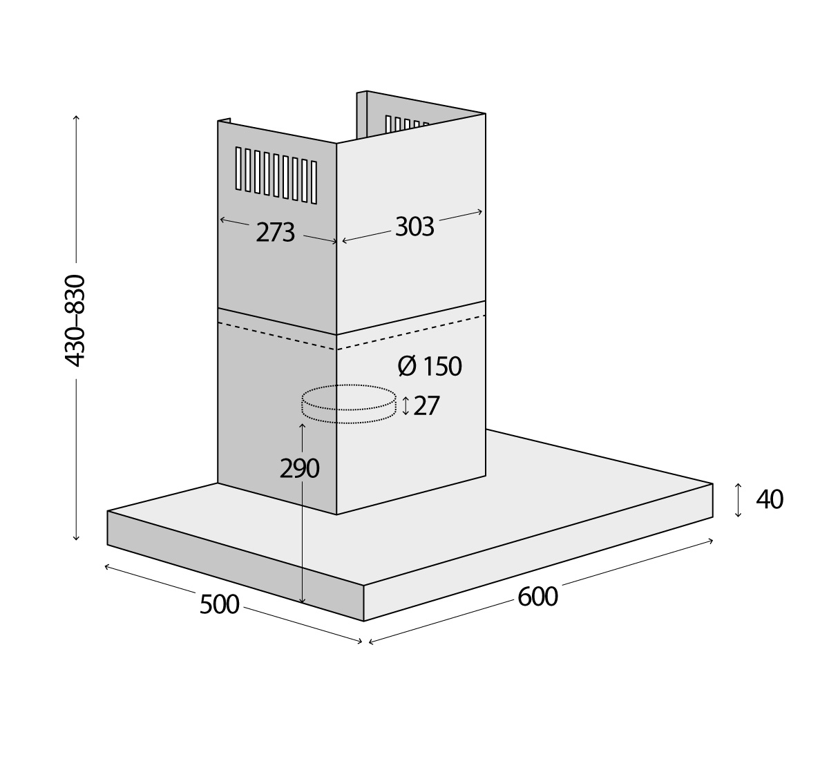 Výška odsavače je variabilní a zpravidla je udávaná v minimálních a maximálních hodnotách. V balení jsou k dispozici dvě části „komínu“, které do sebe „zapadají“. Díky tomu si můžete výšku uzpůsobit přesně podle svých potřeb.