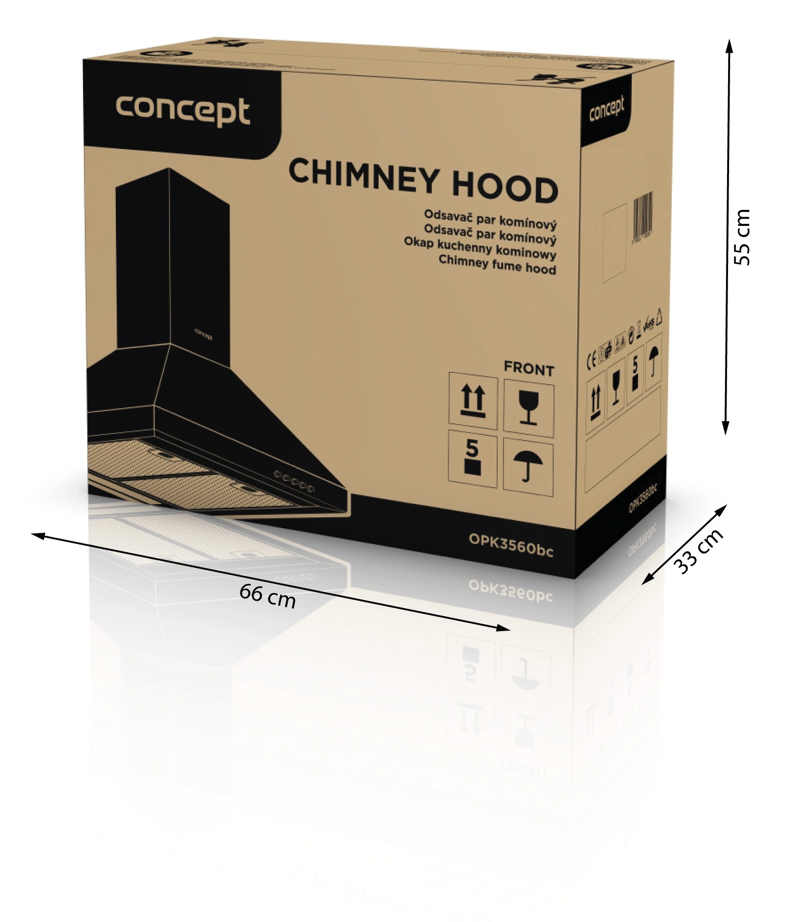 <b><p>Poškozený vnější obalový materiál. Výrobek je nový a nepoužívaný, ve 100% technickém a funkčním stavu, s plnou zárukou 24 měsíců. Na tuto položku se nevztahují slevové akce a dárky.</p> </b> Odsavač par komínový OPK3560bc s výkonem 537,3 m3/h poskytuje 3 stupně odvětrávání a možnost odtahu i recirkulace. Je vybaven úsporným LED osvětlením a nastavitelnou výškou, kterou si uzpůsobíte podle svých potřeb.