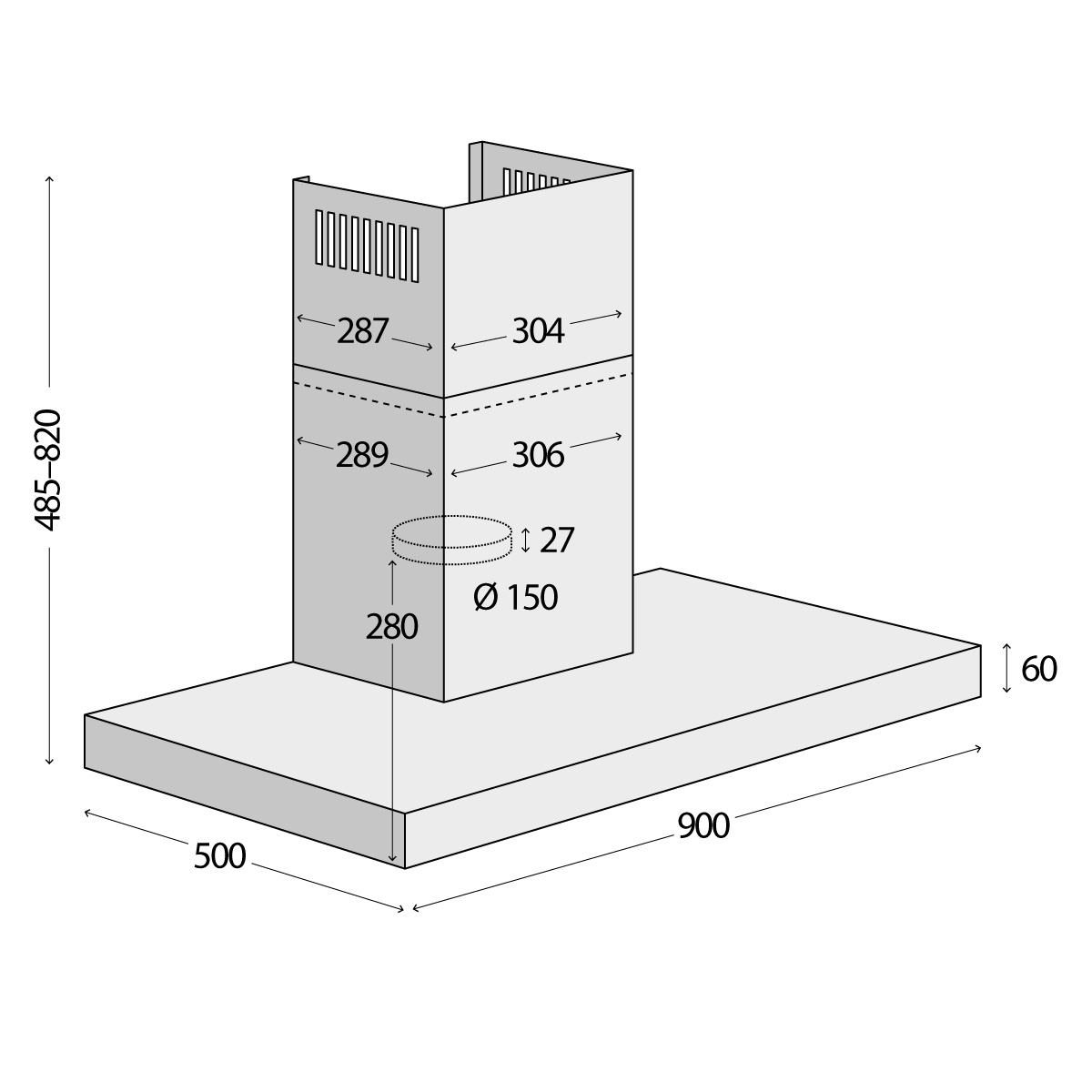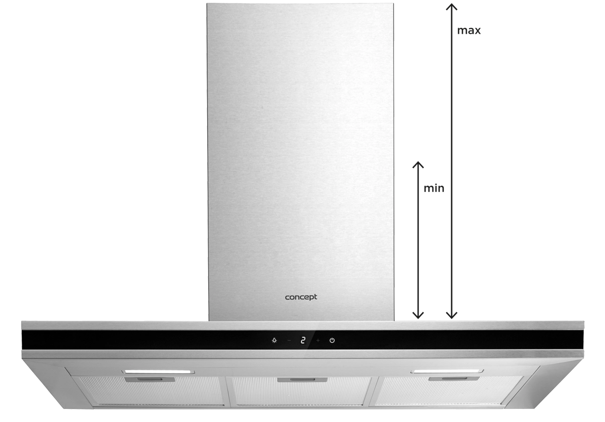Výška odsavače je zpravidla udávaná v minimálních a maximálních hodnotách. V balení jsou k dispozici dvě části komínu, které do sebe zapadají, takže si výšku můžete nastavit přesně podle svých potřeb.