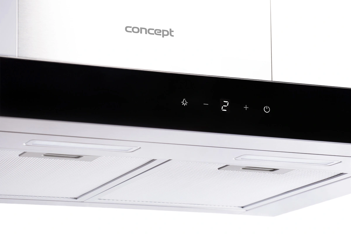 Komínový odsavač par Concept OPK4760bc v nerezovém provedení elegantně doplňuje přední lišta v designu černého skla. Dosahuje max. výkonu 630 m2/h a nabízí 3 stupně odtahu a možnost recirkulace. Je součástí designové linie BLACK.