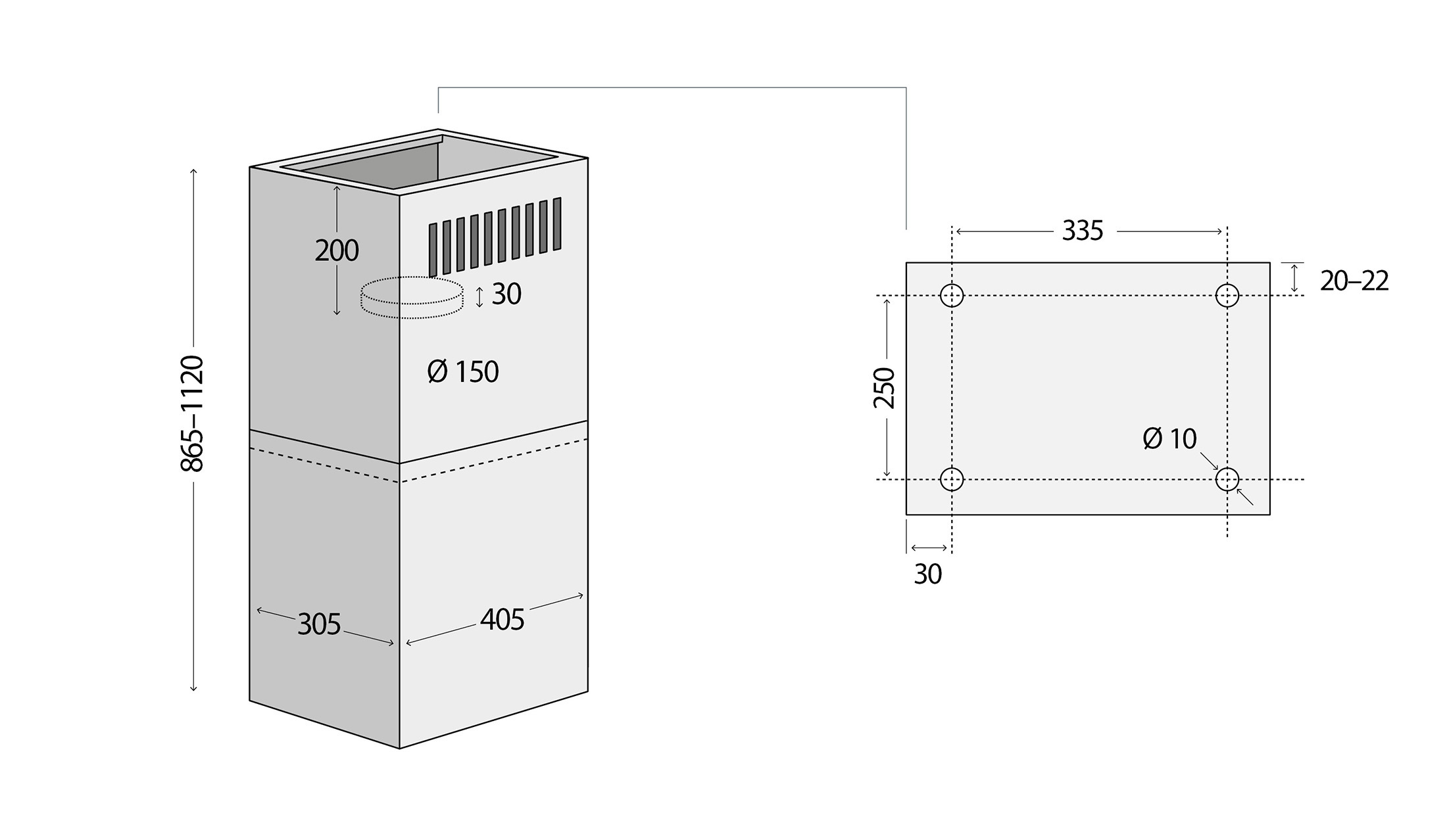 Výška odsavače je zpravidla udávaná v minimálních a maximálních hodnotách. Dle libosti si můžete uzpůsobit výšku odsavače. V balení jsou k dispozici dvě části "komínu", které do sebe "zapadají". Vy si můžete tuto výšku nastavit přesně podle svých představ.