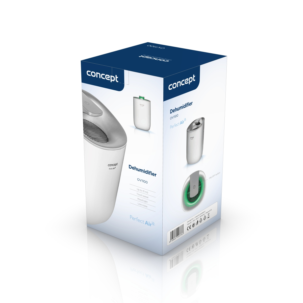 <b><p>Poškozený vnější obalový materiál. Výrobek je nový a nepoužívaný, ve 100% technickém a funkčním stavu s plnou zárukou 24 měsíců. Na tuto položku se nevztahují slevové akce a dárky.</p> </b> Odvlhčovač vzduchu Concept OV1100 z řady Perfect Air je vhodný pro použití v koupelně a v místnostech do 15 m2. Vyniká moderním designem s LED podsvícením a tichým provozem. Je vybaven 600 ml zásobníkem na vodu a za den zkondenzuje 300 ml vody.