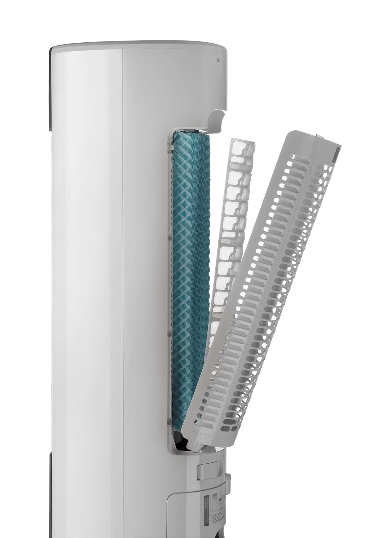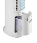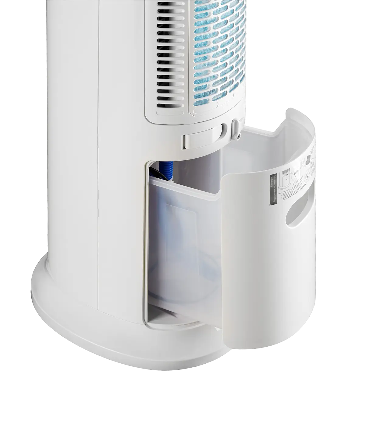 Přístroj profukuje vzduch přes vodní filtry, a tím dochází k jeho ochlazení. K provozu tak stačí naplnit nádržku vodou, a pokud chcete vzduch ještě více ochladit, přidáte k vodě chladící náplně, které jsou součástí balení. Zásobník s ukazatelem vodní hladiny má objem 7 l. Pokud ho vyjmete nebo bude prázdný, přístroj se automaticky vypne.