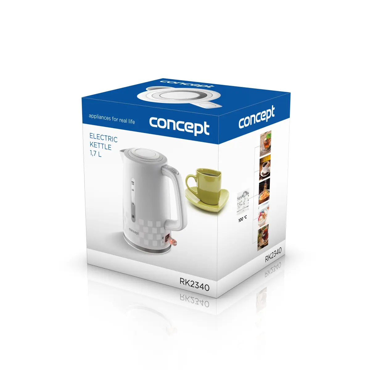 <b><p>Poškozený vnější obalový materiál. Výrobek je nový a nepoužívaný, ve 100% technickém a funkčním stavu s plnou zárukou 24 měsíců. Na tuto položku se nevztahují slevové akce a dárky.</p> </b> Rychlovarná konvice Concept RK2340 upoutá svým atraktivním 3D designem. Nabízí objem 1,7 l, kvalitní bezpečnostní konektor a dvojnásobný bezpečnostní systém.