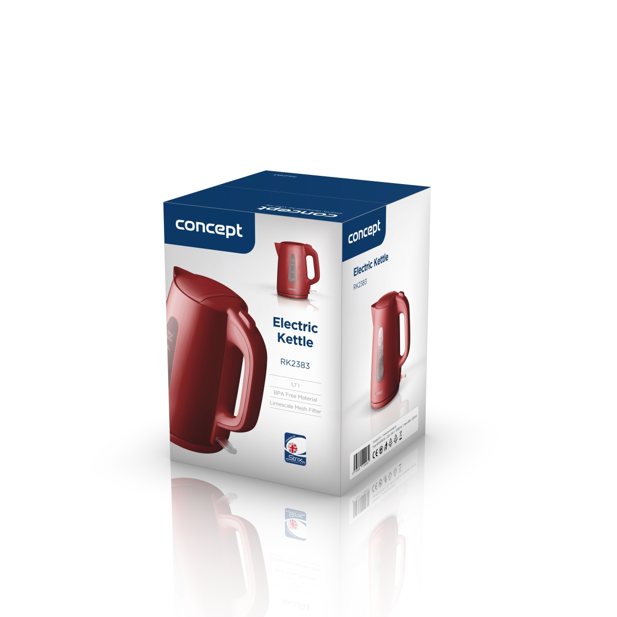 <b><p>Poškozený vnější obal. Výrobek je nový a nepoužívaný, ve 100% technickém a funkčním stavu s plnou zárukou 24 měsíců. Na tuto položku se nevztahují slevové akce a dárky.</p> </b> Rychlovarná konvice Concept RK2383 s objemem 1,7 l disponuje kvalitním značkovým konektorem STRIX, skrytým topným tělesem a trojnásobnou bezpečnostní pojistkou.