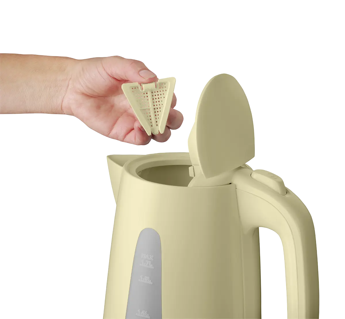Konvice je opatřena tlačítkem pro snadné otevření víka a velkým plnicím otvorem pro pohodlné plnění vodou. Hladké dno se skrytým topným tělesem zamezuje usazování nečistot. Filtr proti vodním usazeninám je vyjímatelný, takže ho můžete kdykoliv dle potřeby vyčistit. Praktický je i plně otočný podstavec s prostorem pro uschování přebytečného kabelu, na který můžete konvici postavit z jakéhokoliv úhlu.