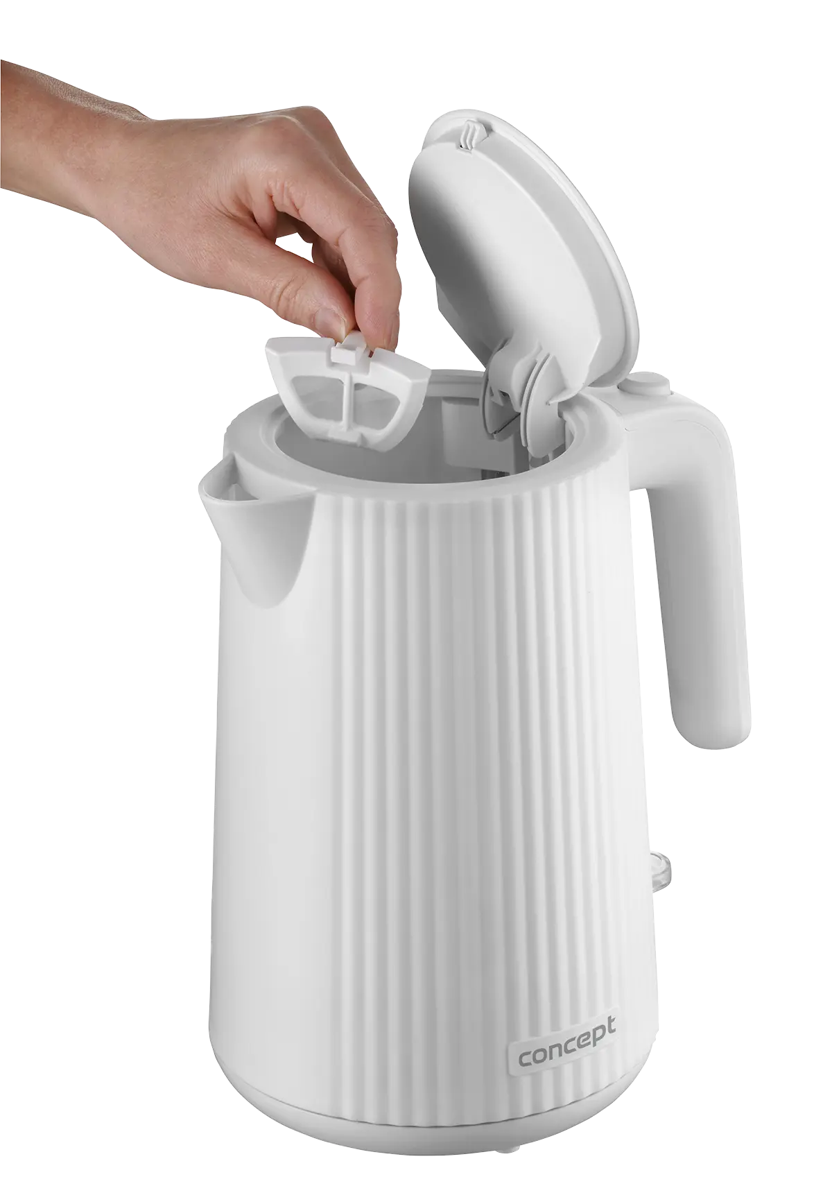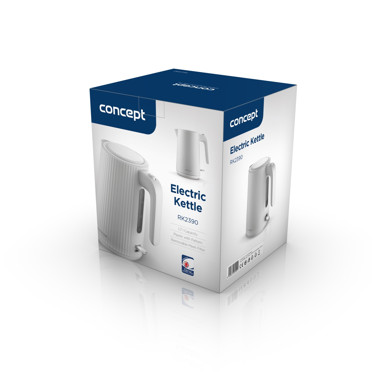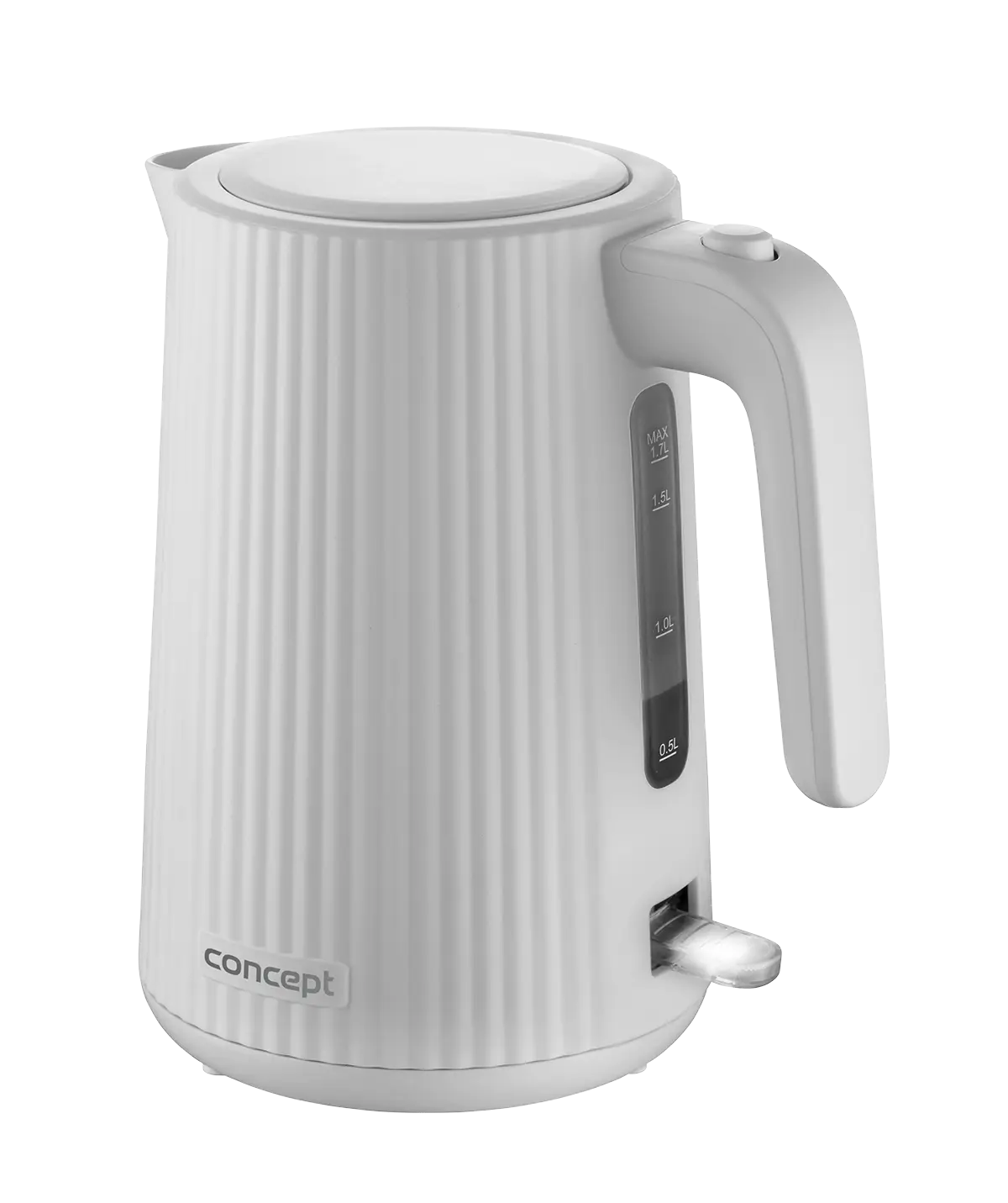 <b><p>Poškozený vnější obalový materiál. Výrobek je nový a nepoužívaný, ve 100% technickém a funkčním stavu s plnou zárukou 24 měsíců. Na tuto položku se nevztahují slevové akce a dárky.</p> </b> Rychlovarná konvice Concept RK2390 s objemem 1,7 l je vybavena trojnásobnou bezpečnostní pojistkou a značkovým konektorem Strix. Na první pohled zaujme atraktivním vroubkovaným designem v bílé barvě.