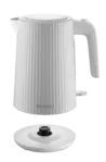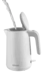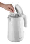 Elegantní plastová konvice s objemem 1,7 l zaujme svým stylovým bílým vroubkovaným designem, který se hodí do každé kuchyně. Praktická kontrolka provozu s jemným bílým podsvícením signalizuje, kdy je konvice v chodu, a zajišťuje tak přehledné a bezpečné používání. Díky velkému objemu připravíte snadno dostatek horké vody pro celou rodinu.