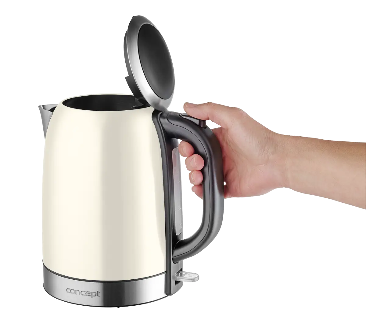 Konvice je zpracována tak, aby její obsluha byla co nejjednodušší. Je opatřena širokým hrdlem pro snadné nalévání vody do šálků a tlačítkem v rukojeti pro rychlé otevření víka. Praktický je i jemný filtr proti vodnímu kameni, který je vyjímatelný, takže se snadněji čistí. Další výhodou je otočná základna, která zrychluje manipulaci s konvicí.
