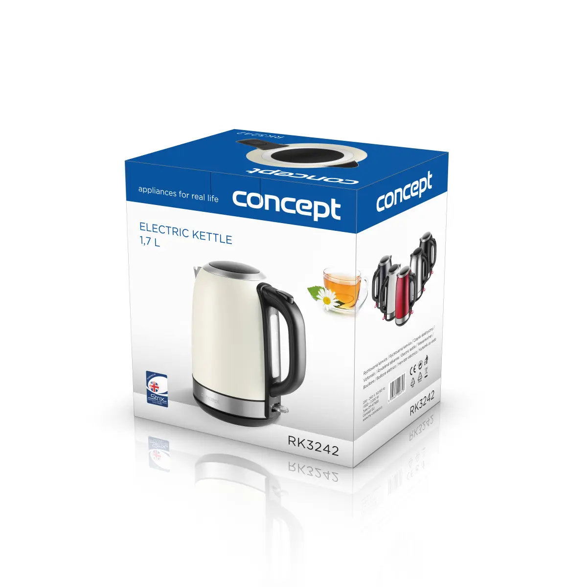 <b><p>Poškozený vnější obalový materiál. Výrobek je nový a nepoužívaný, ve 100% technickém a funkčním stavu s plnou zárukou 24 měsíců. Na tuto položku se nevztahují slevové akce a dárky.</p> </b> Rychlovarná konvice RK3242 s objemem 1,7 l je zárukou dlouhé životnosti, bezpečnosti a snadné obsluhy. Vybírat můžete ze 6 barevných variant.