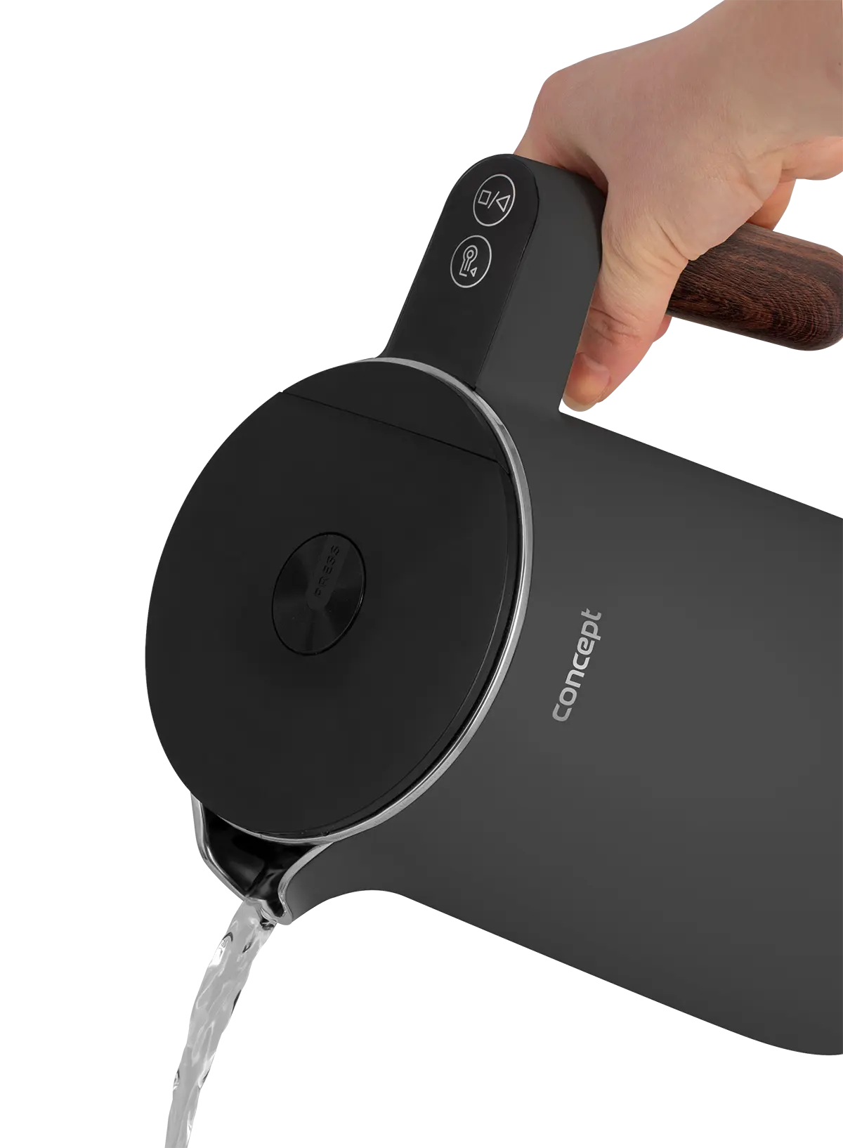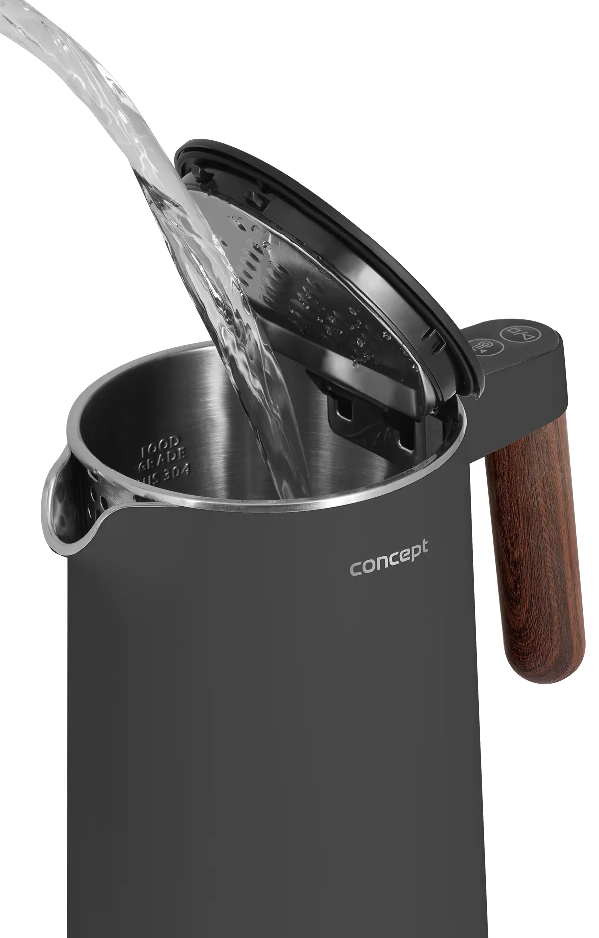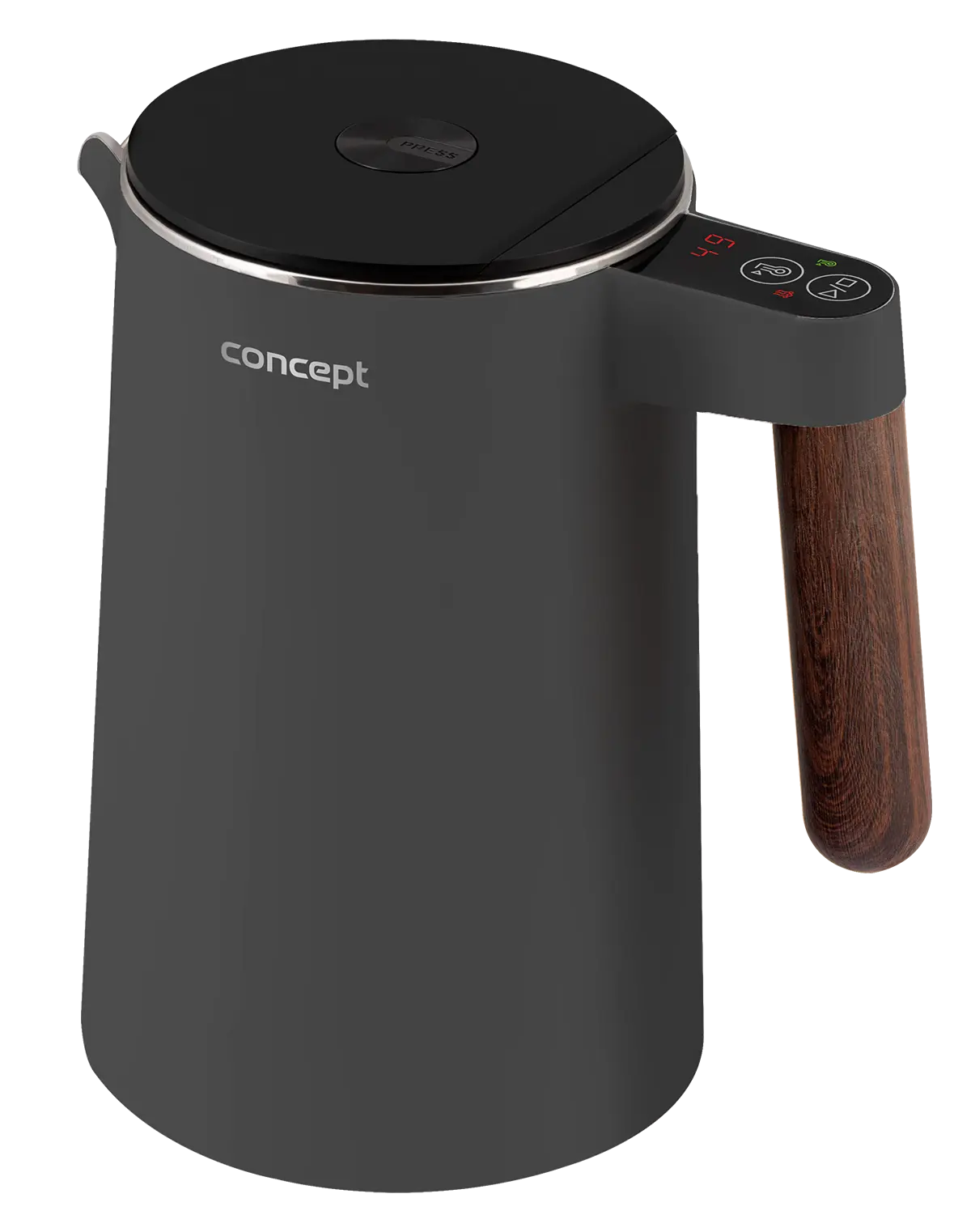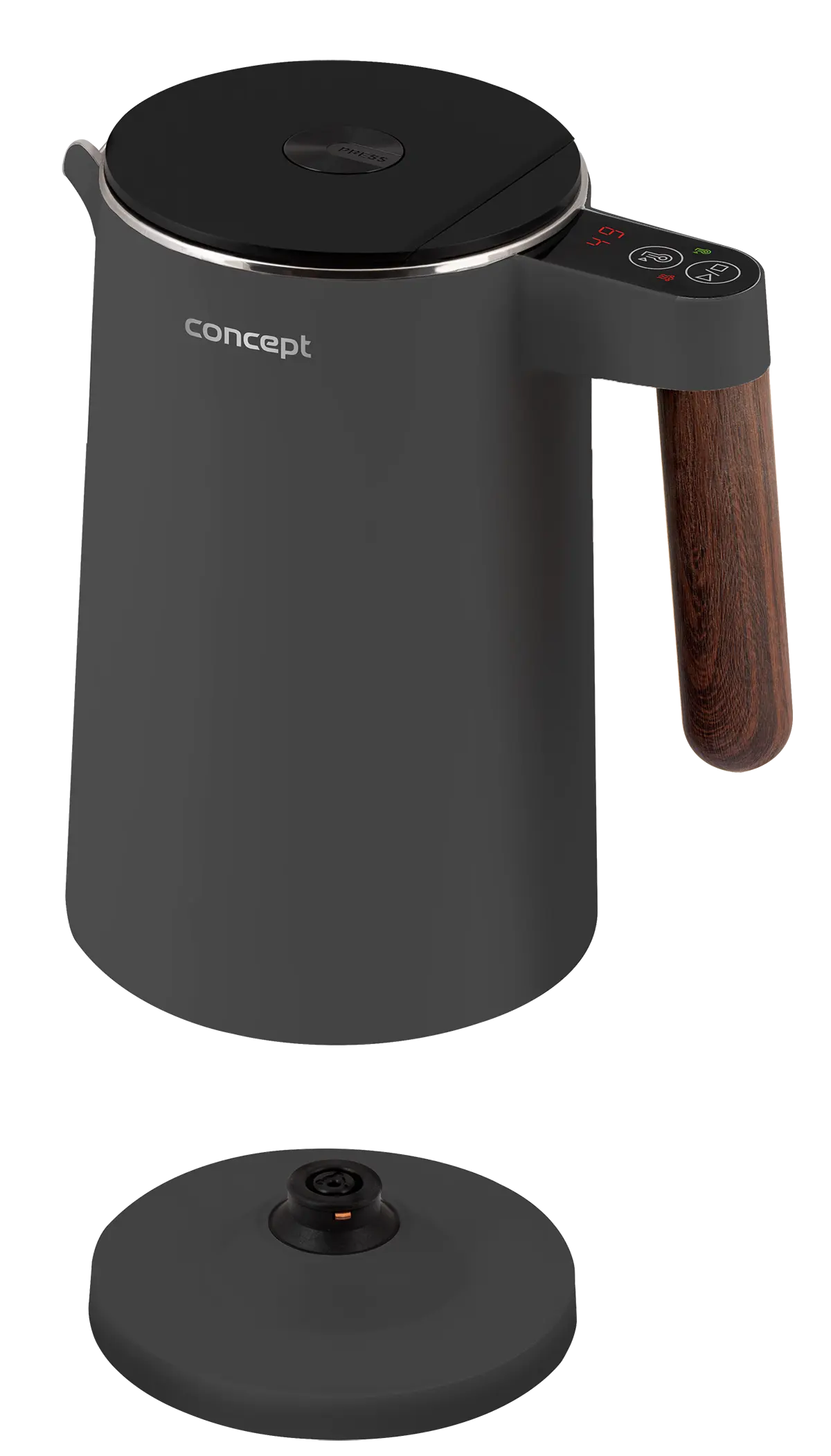 Rychlovarná konvice Concept RK3305 Norwood si najde místo v každé domácnosti. Její atraktivní design podtrhuje matné tělo v tmavě šedé barvě doplněné o elegantní madlo v designu dřeva. Velice elegantně působí i minimalistický podstavec, na kterém je konvice usazená. S objemem 1,5 l s ní pohodlně připravíte až 6 šálků vašeho oblíbeného horkého nápoje.