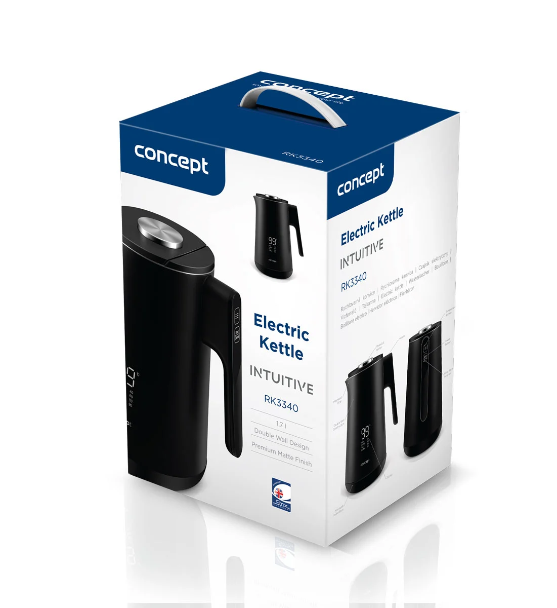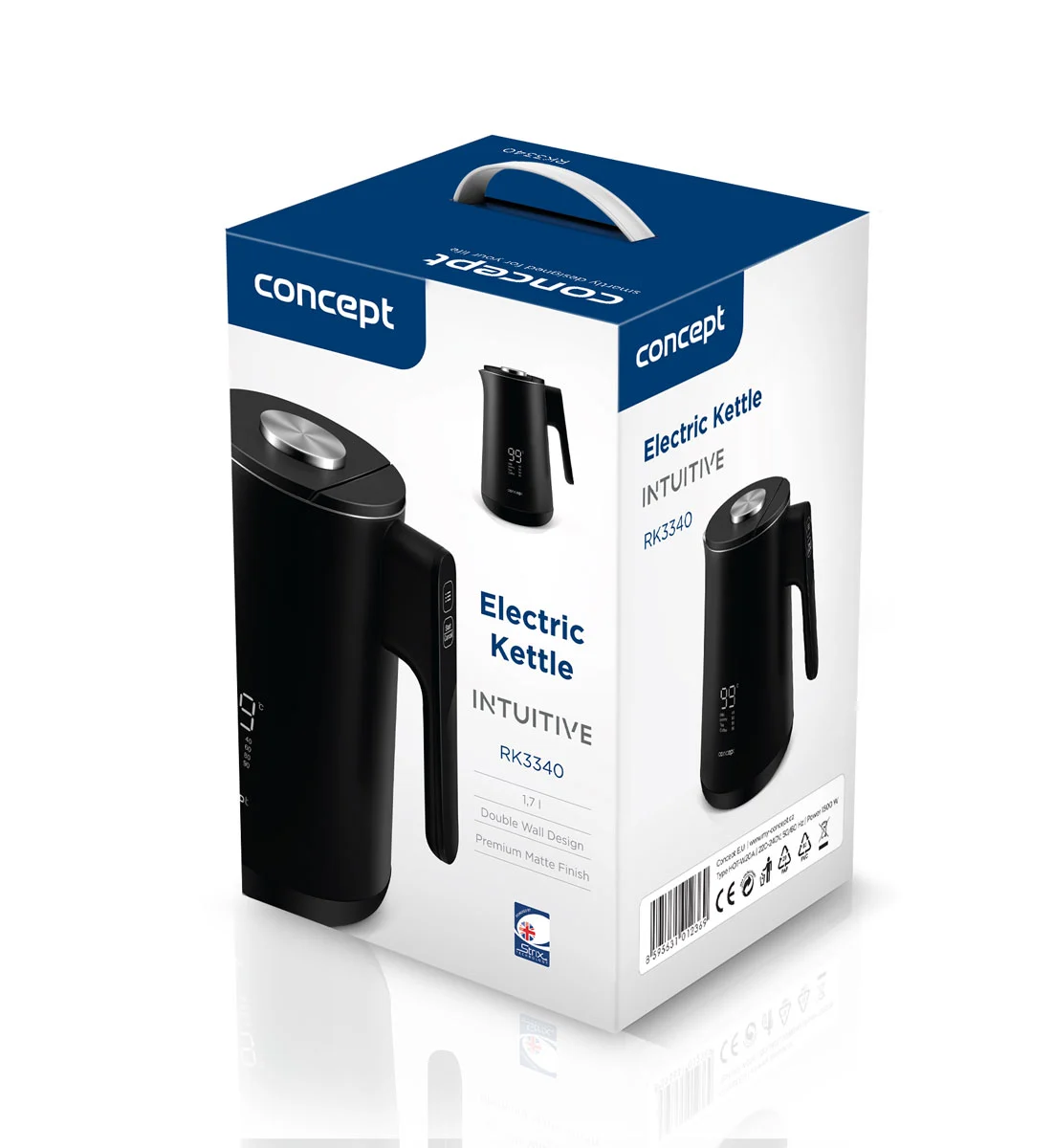 <b><p>Zánovní produkt je minimálně či jen krátkodobě používaný. Výrobek je v pořádku, může jevit známky použití. Na zboží se vztahuje plná záruka 24 měsíců. Na tuto položku se nevztahují slevové akce a dárky. </p> </b> Digitální rychlovarná konvice Concept RK3340 INTUITIVE vyniká elegantním dvouplášťovým provedením a přehledným displejem. Nabízí objem 1,7 l, možnost regulace teploty a bezpečný cool touch povrch, díky kterému zůstane neustále chladná na dotek.