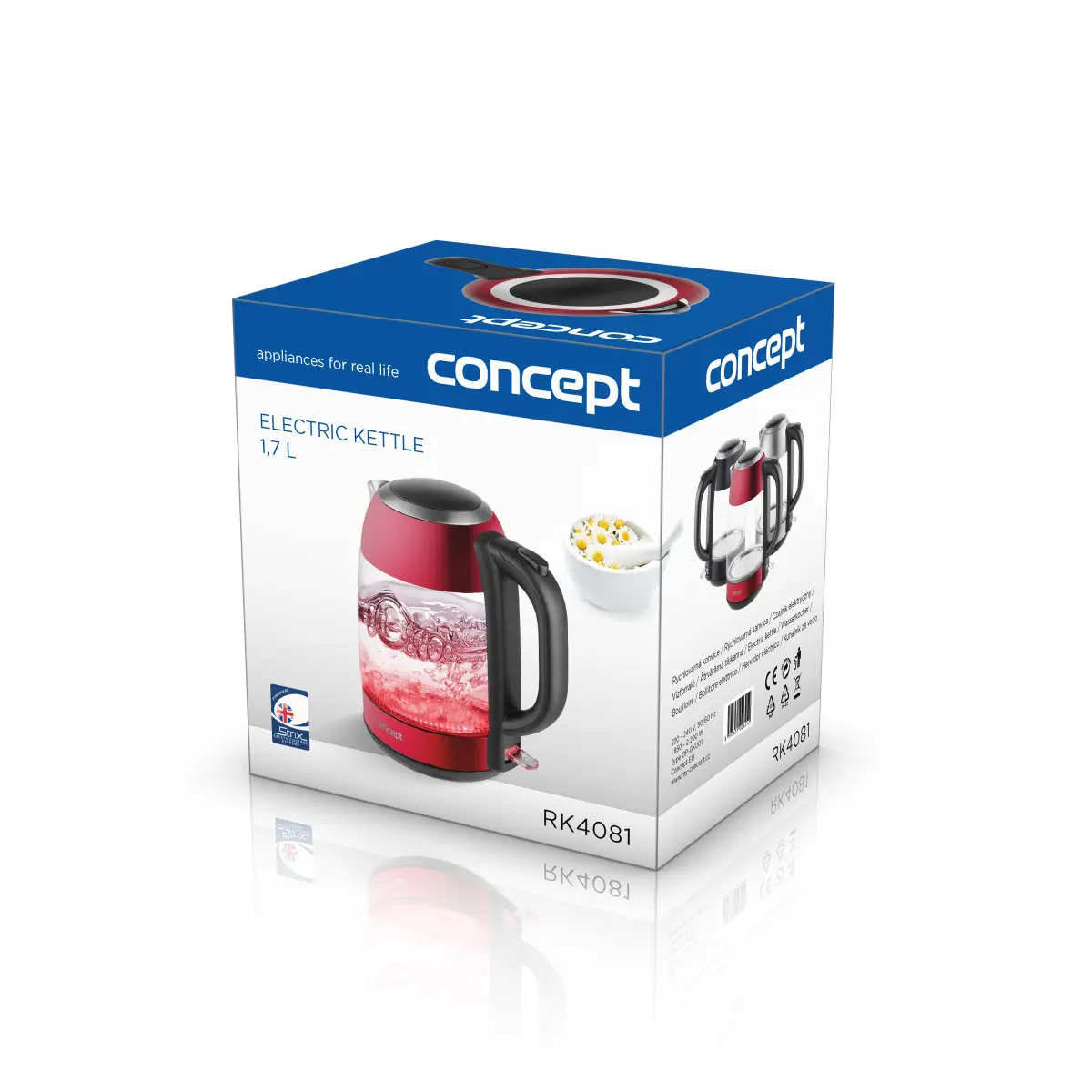 <b><p>Poškozený vnější obalový materiál. Výrobek je nový a nepoužívaný, ve 100% technickém a funkčním stavu s plnou zárukou 24 měsíců. Na tuto položku se nevztahují slevové akce a dárky.</p> </b> Skleněná rychlovarná konvice Concept RK4081 o objemu 1,7 l je opatřena moderním barevným LED podsvícením, díky kterému se stane ozdobou každé kuchyně.