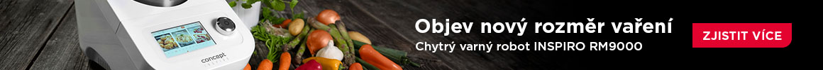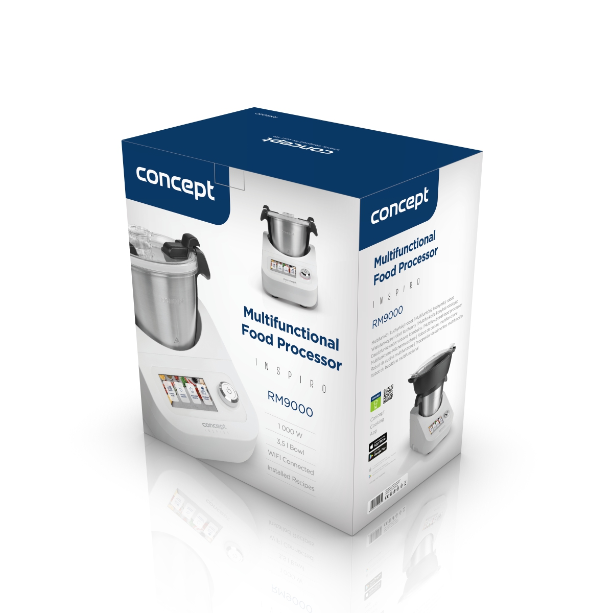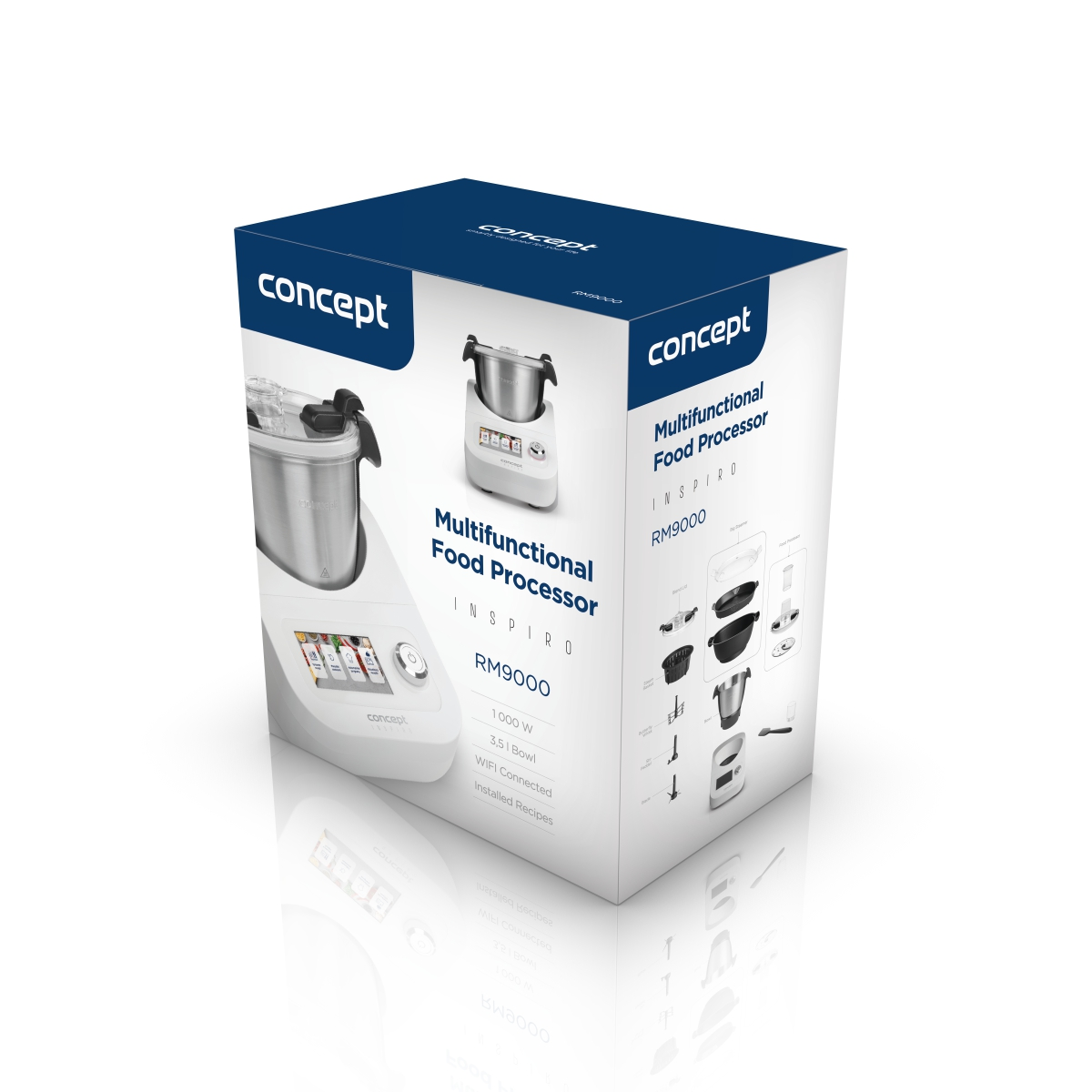 <b><p>Poškozený vnější obalový materiál. Výrobek je nový a nepoužívaný, ve 100% technickém a funkčním stavu s plnou zárukou 24 měsíců. Na tuto položku se nevztahují slevové akce a dárky.</p> </b> Multifunkční kuchyňský robot Concept RM9000 INSPIRO vás krok za krokem provede celým procesem vaření. Disponuje databází receptů, která se neustále aktualizuje, 8 automatickými programy s 15 funkcemi a dotykovým ovládáním v českém jazyce.