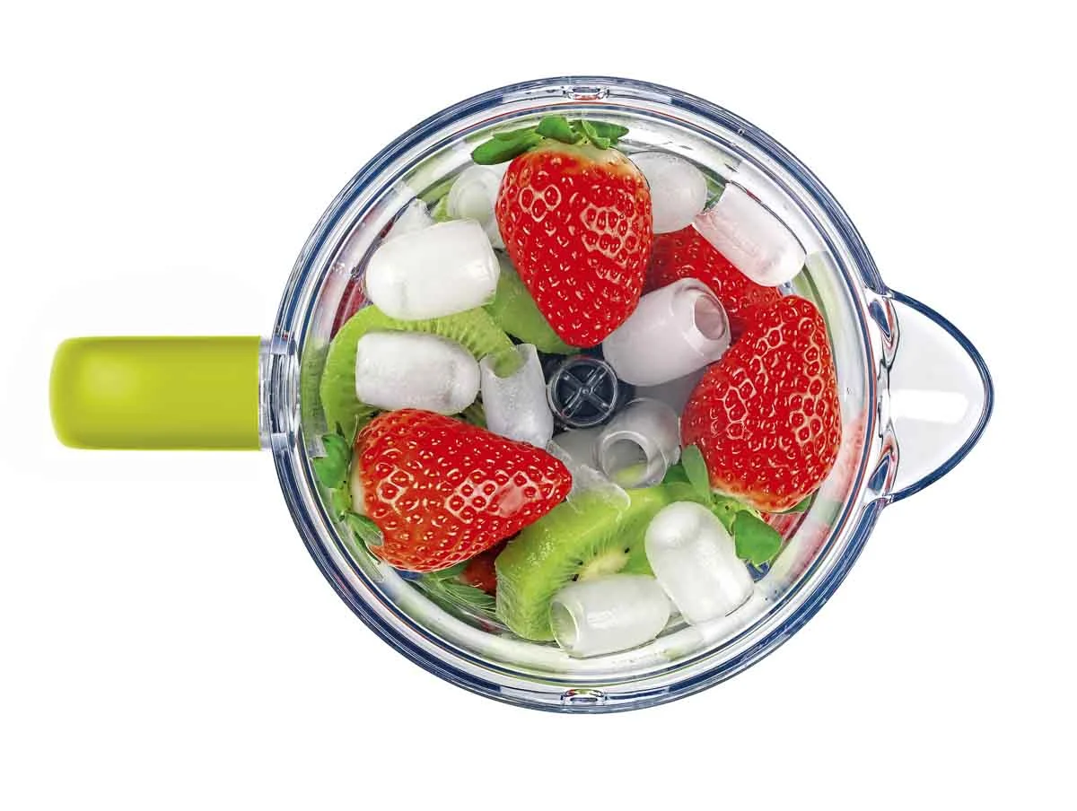 Přesně tak, jen jediné otočení nádobou umístěnou v mixéru Vás dělí od lahodného smoothie, třeba k snídani. Tritanová lahev slouží přímo k mixování, po mixování jednoduše vyměníte nože za víčko a můžete vyrazit. Víčko je navíc vybavené poutkem a speciálním dvojitým těsněním. Nemusíte mít strach, že by se smoothie vylilo třeba do kabelky. Navíc se z lahve perfektně pije třeba během chůze, ale pohodlně zapadne do držáku nápojů v autě.