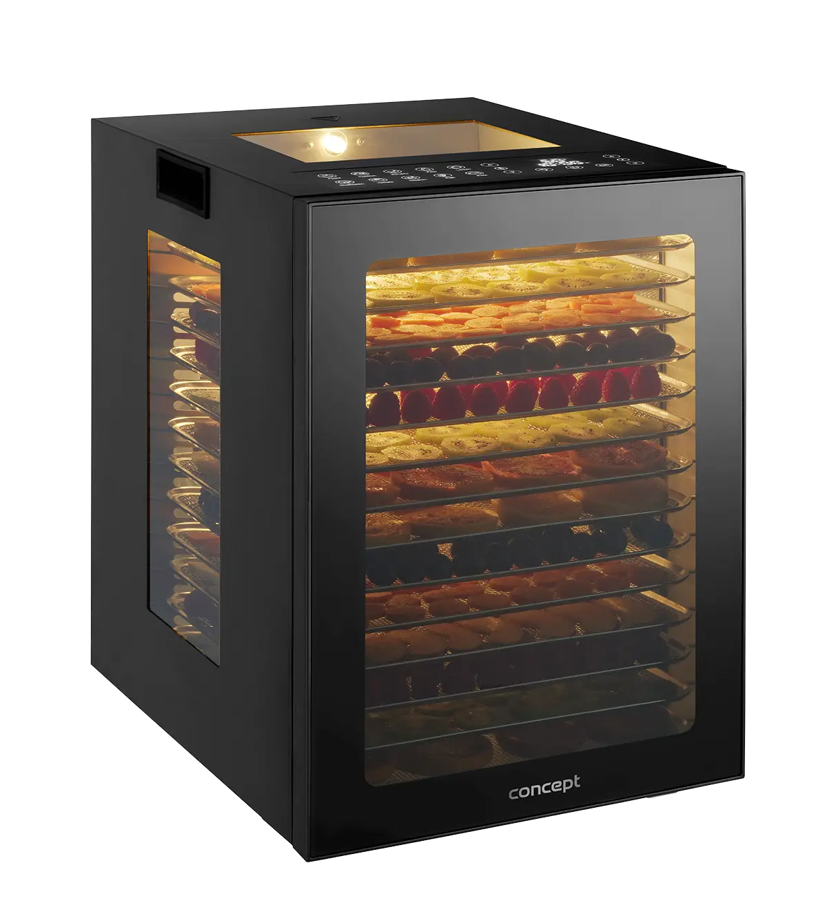<b><p>Poškozený vnější obalový materiál. Výrobek je nový a nepoužívaný, ve 100% technickém a funkčním stavu s plnou zárukou 24 měsíců. Na tuto položku se nevztahují slevové akce a dárky.</p> </b> Digitální sušička na ovoce 850 W Concept SO5000 disponuje moderním LED displejem s digitálním ovládáním, 10 přednastavenými programy, 14 nerezovými platy, platem na bylinky, RAW platem, praktickým vnitřním osvětlením a ventilátorem pro rovnoměrné sušení. Nabízí regulaci teploty v rozmezí od 35 do 75 stupňů a časovač s nastavením až na 48 h.