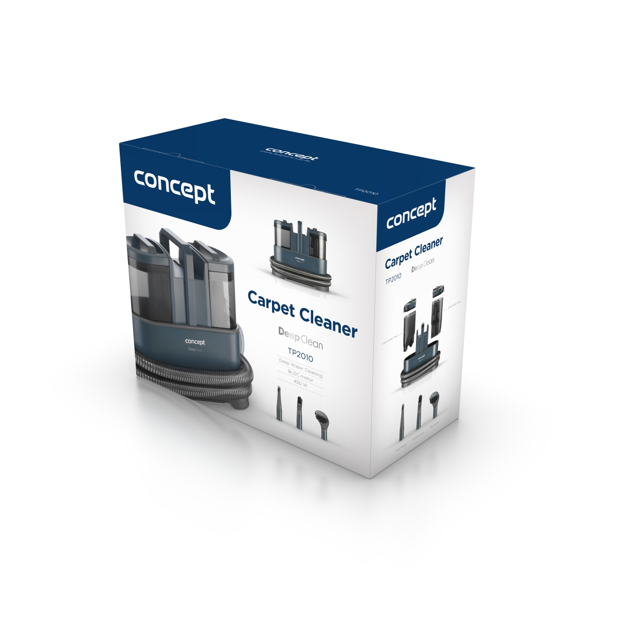 <b><p>Poškozený vnější obalový materiál. Výrobek je nový a nepoužívaný, ve 100% technickém a funkčním stavu s plnou zárukou 24 měsíců. Na tuto položku se nevztahují slevové akce a dárky.</p> </b> Tepovač DEEPCLEAN 450 W Concept TP2010 se sacísilou 11,5 kPa nabízí hloubkové čištění textilních povrchů v domácnosti i v autě. Je vybaven 4 hubicemi - štěrbinovou, na koberce, čalounění a obuv.