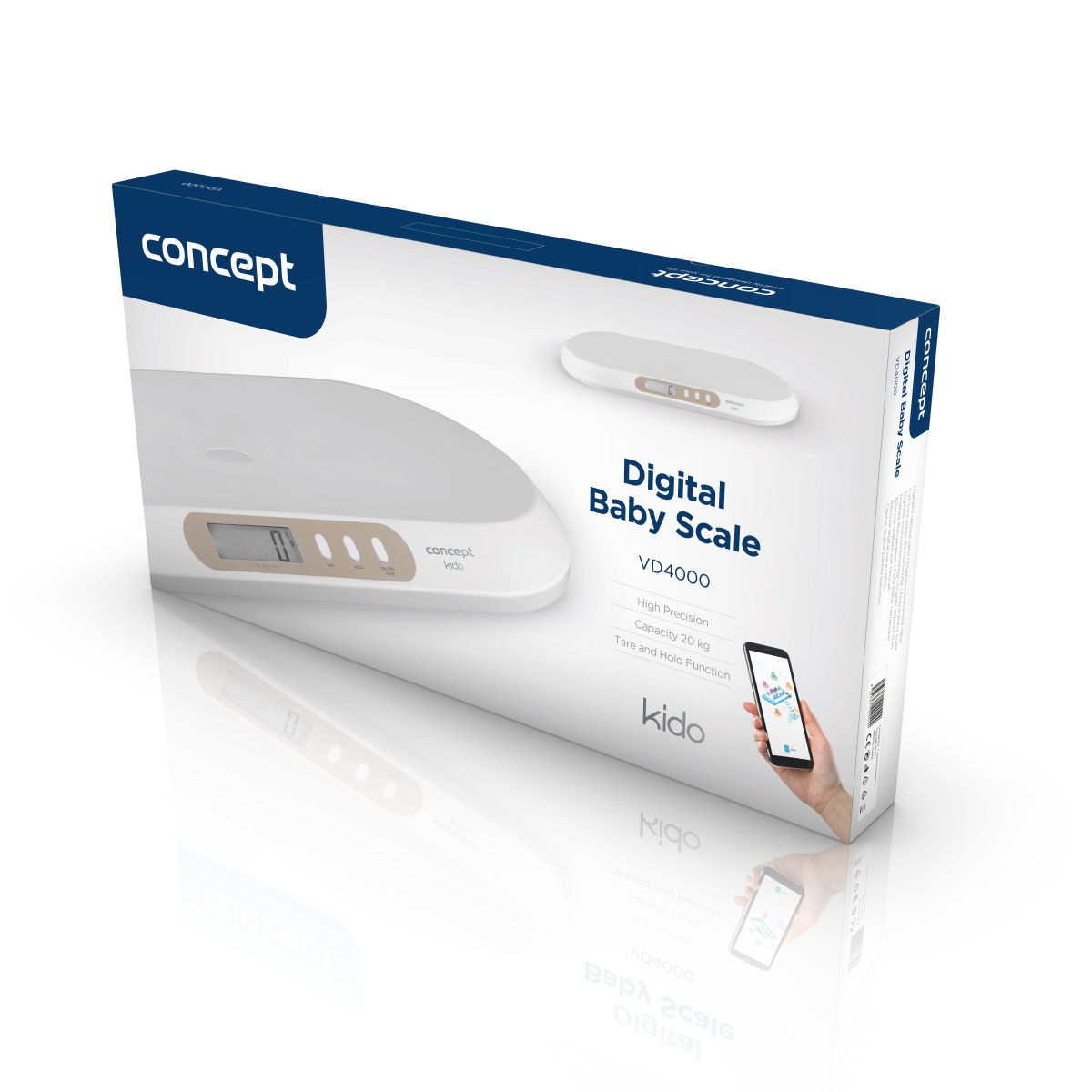 <b><p>Poškozený vnější obalový materiál. Výrobek je nový a nepoužívaný, ve 100% technickém a funkčním stavu s plnou zárukou 24 měsíců. Na tuto položku se nevztahují slevové akce a dárky.</p> </b> Kojenecká váha s aplikací Concept VD4000 KIDO nabízí velmi přesné vážení, nosnost 20 kg a možnost propojení s mobilní aplikací, ve které můžete sledovat vývoj vašeho dítěte. Je vybavená funkcemi Tare pro odečet věcí vážených s miminkem a Hold, se kterou zvážíte i neklidné dítě.