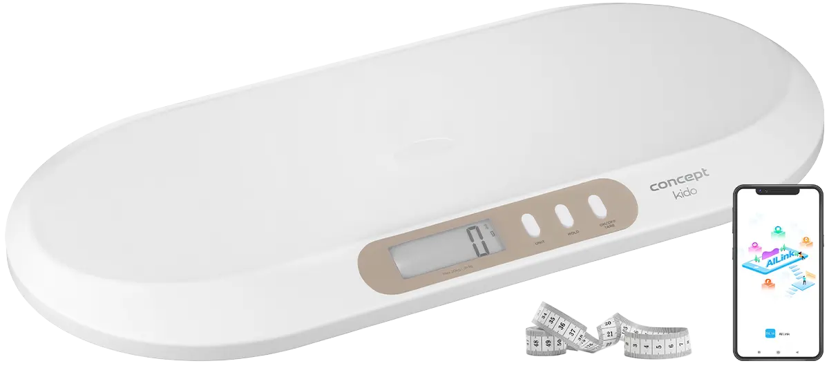 Kojeneckou váhu Concept VD4000 KIDO můžete propojit přes Bluetooth s mobilní aplikací Ailink, která vám pomůže uchovávat naměřené hodnoty. Aktuální váhu dokáže porovnat s posledními naměřenými hodnotami a poskytnout okamžitý přehled o vývoji vašeho dítěte. Tyto hodnoty budou užitečné nejen pro vaši potřebu, ale i pro pediatra. Aplikace pojme údaje až 8 uživatelů. Váhu tedy můžete sdílet v rámci celé rodiny a sledovat vývoj vlastních dětí i ostatních ratolestí svých blízkých. Kromě váhy, která se do aplikace propíše automaticky, můžete sledovat také výšku miminka a obvod hlavy. Tyto údaje je však nutné zadat ručně. Ke zjištění hodnot můžete využít metr, který je součástí balení.