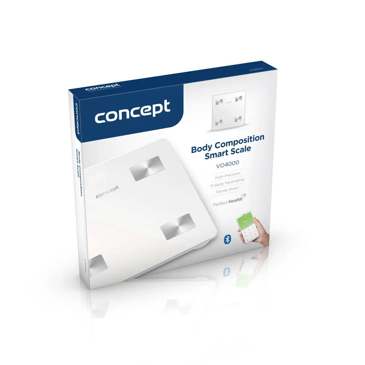 <b><p>Poškozený vnější obalový materiál. Výrobek je nový a nepoužívaný, ve 100% technickém a funkčním stavu s plnou zárukou 24 měsíců. Na tuto položku se nevztahují slevové akce a dárky.</p> </b> Osobní diagnostická váha Concept VO4000 Perfect Health přináší komplexní analýzu těla. Nabízí nosnost 180 kg a dokáže změřit 13 tělesných parametrů pomocí bioelektrické impedance. S aplikací Feelfit budete mít všechny údaje pod kontrolou.