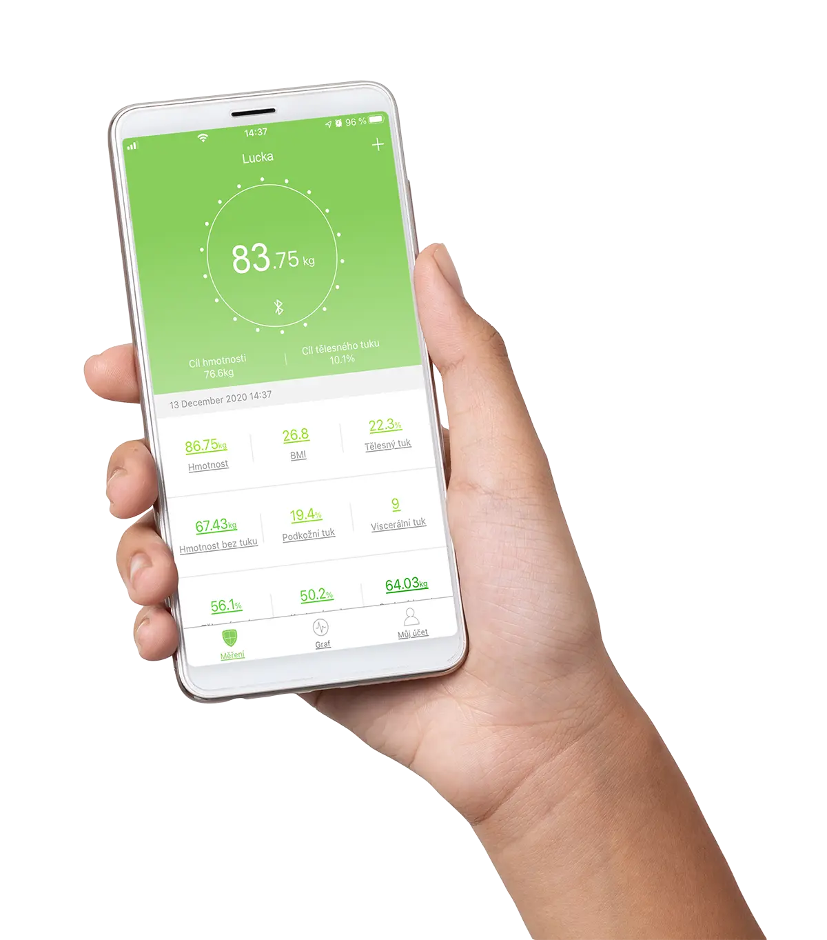 • Kompletní analýza těla (13 parametrů: hmotnost, BMI, tělesný tuk, hmotnost bez tuku, podkožní tuk, viscerální tuk, tělesná voda, kosterní svaly, svalová hmota, kostní hmota, protein, BMR, metabolický věk)