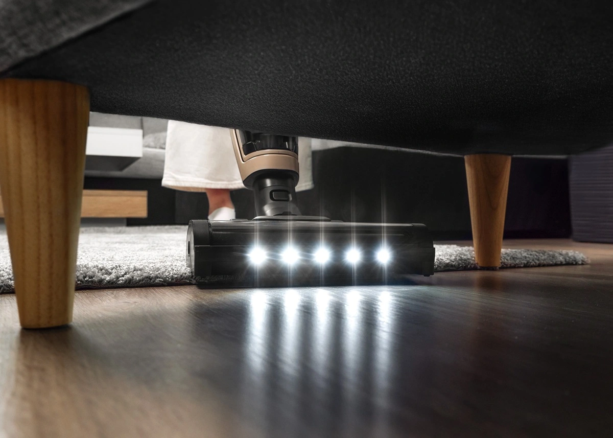 LED osvětlení umístěné na turbokartáči skvěle nasvítí prostor před vysavačem, takže vám neunikne ani smítko pod nábytkem nebo v hůře dostupných koutech.