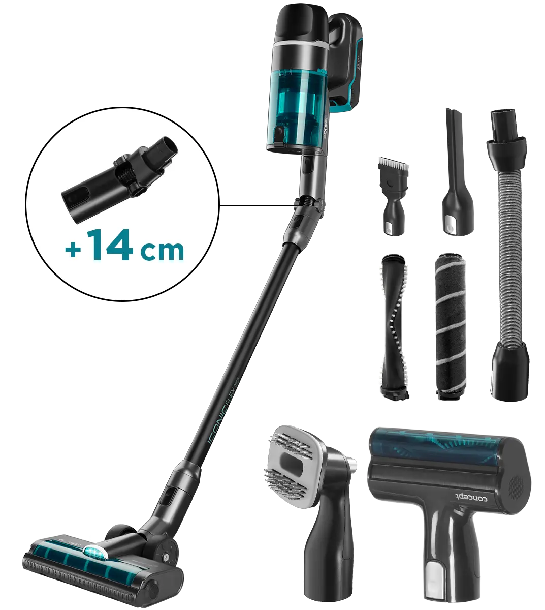 S tyčovým a ručním aku vysavačem 2v1 Iconic Animal Smart Flex Concept VP6130 pohodlně uklidíte celý dům i byt. Nabízí dlouhou dobu provozu až 60 minut a je vhodný na všechny typy podlah. Můžete ho využít jako klasický tyčový vysavač nebo odejmout ruční jednotku a uklidit všechna špatně přístupná místa nebo interiér auta. Disponuje lehkou konstrukcí a ergonomickou rukojetí, takže se dobře drží a pohodlně ovládá. Díky speciálnímu příslušenství je vhodný především pro domácnosti se zvířecími mazlíčky.