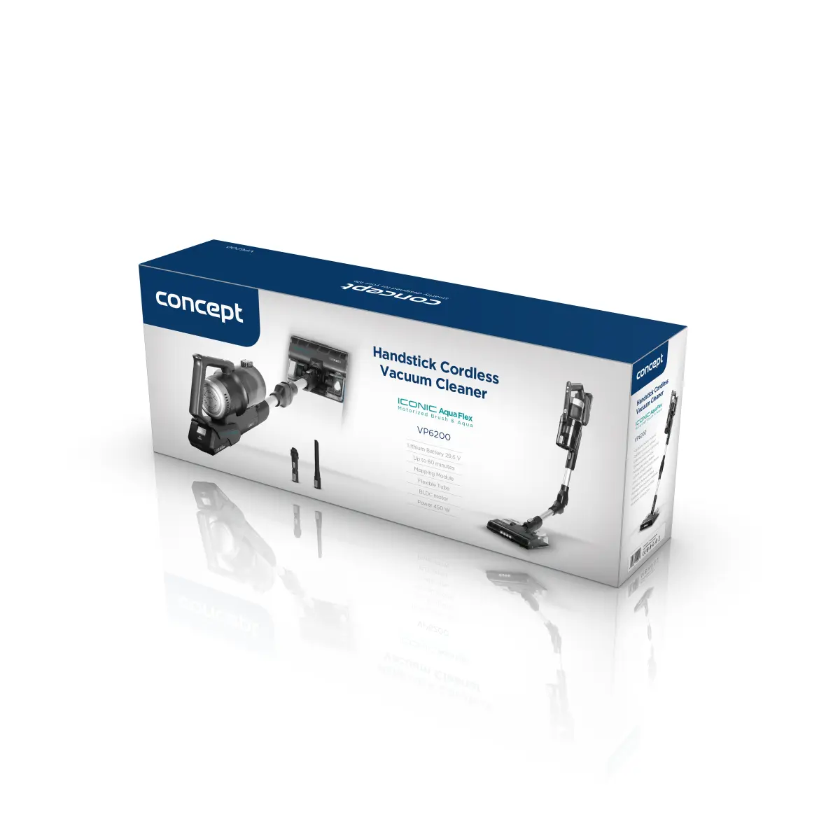 <b><p>Zánovní produkt je minimálně či jen krátkodobě používaný. Výrobek je v pořádku, může jevit známky použití. Na zboží se vztahuje plná záruka 24 měsíců. Na tuto položku se nevztahují slevové akce a dárky. </p> </b> Tyčový aku vysavač s mopem 3 v 1 Iconic Aqua Flex Concept VP6200 s flexibilním ohebným kloubem nabízí vysoký sací výkon a dlouhou výdrž. Je osazen vyjímatelnou 29,6 V Li-Ion baterií, se kterou můžete uklízet až 60 minut na jedno nabití.
