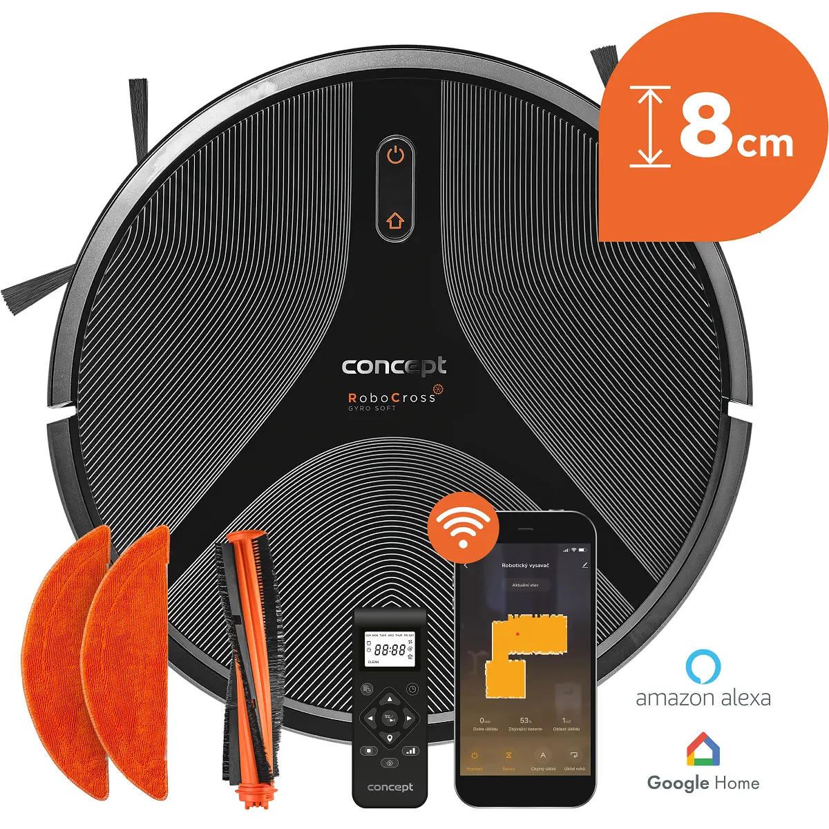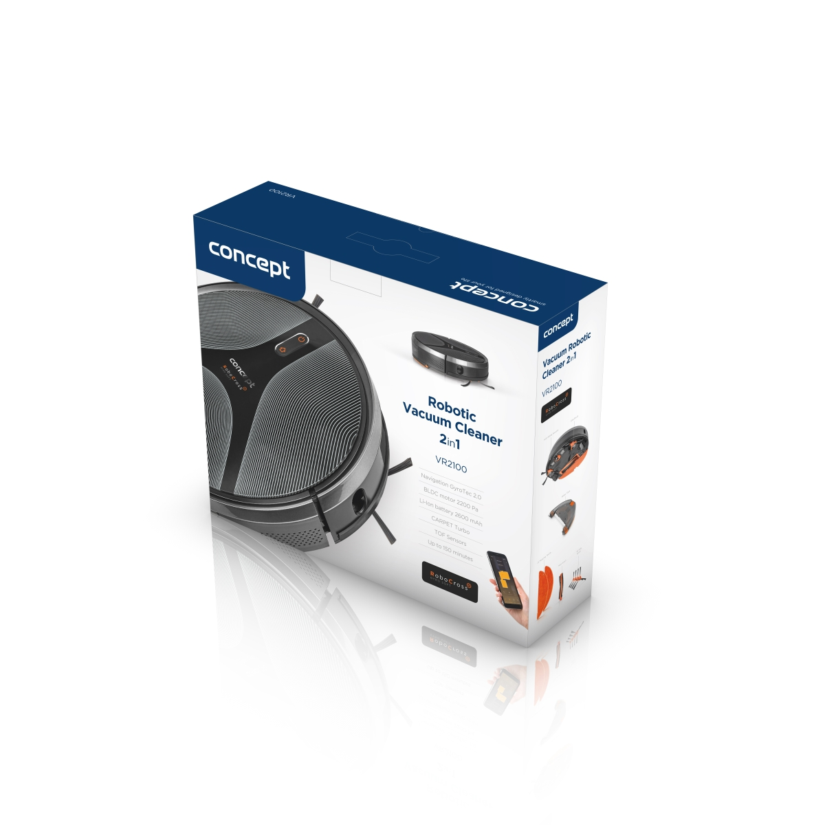 <b><p>Zánovní produkt je minimálně či jen krátkodobě používaný. Výrobek je v pořádku, může jevit známky použití. Na zboží se vztahuje plná záruka 24 měsíců. Na tuto položku se nevztahují slevové akce a dárky. </p> </b> Robotický vysavač s mopem Gyro 2 v 1 Concept VR2100 si poradí se suchým i mokrým úklidem. Na jedno nabití vydrží až 150 min. S výškou pouhých 8 cm uklidí bez problémů i pod nízkým nábytkem. Ovládat ho můžete pomocí aplikace, která je v češtině, přes hlasového asistenta nebo dálkovým ovladačem. Je vybaven magnetickým páskem, který slouží jako virtuální zeď.