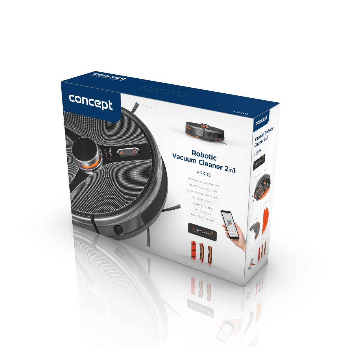 <b><p>Zánovní produkt je minimálně či jen krátkodobě používaný. Výrobek je v pořádku, může jevit známky použití. Na zboží se vztahuje plná záruka 24 měsíců. Na tuto položku se nevztahují slevové akce a dárky. </p> </b> Robotický vysavač s mopem Laser 2v1 Concept VR3115 není úplná novinka, ale upgrade oblíbeného modelu VR3110. Hlavní změnou je, že robot je propojen s mobilní aplikací Concept Home, která nabízí více možností než původní aplikace Concept Robot. Změnu zaznamenal i prachový zásobník, který je rozšířen o přihrádku na aroma tabletu.