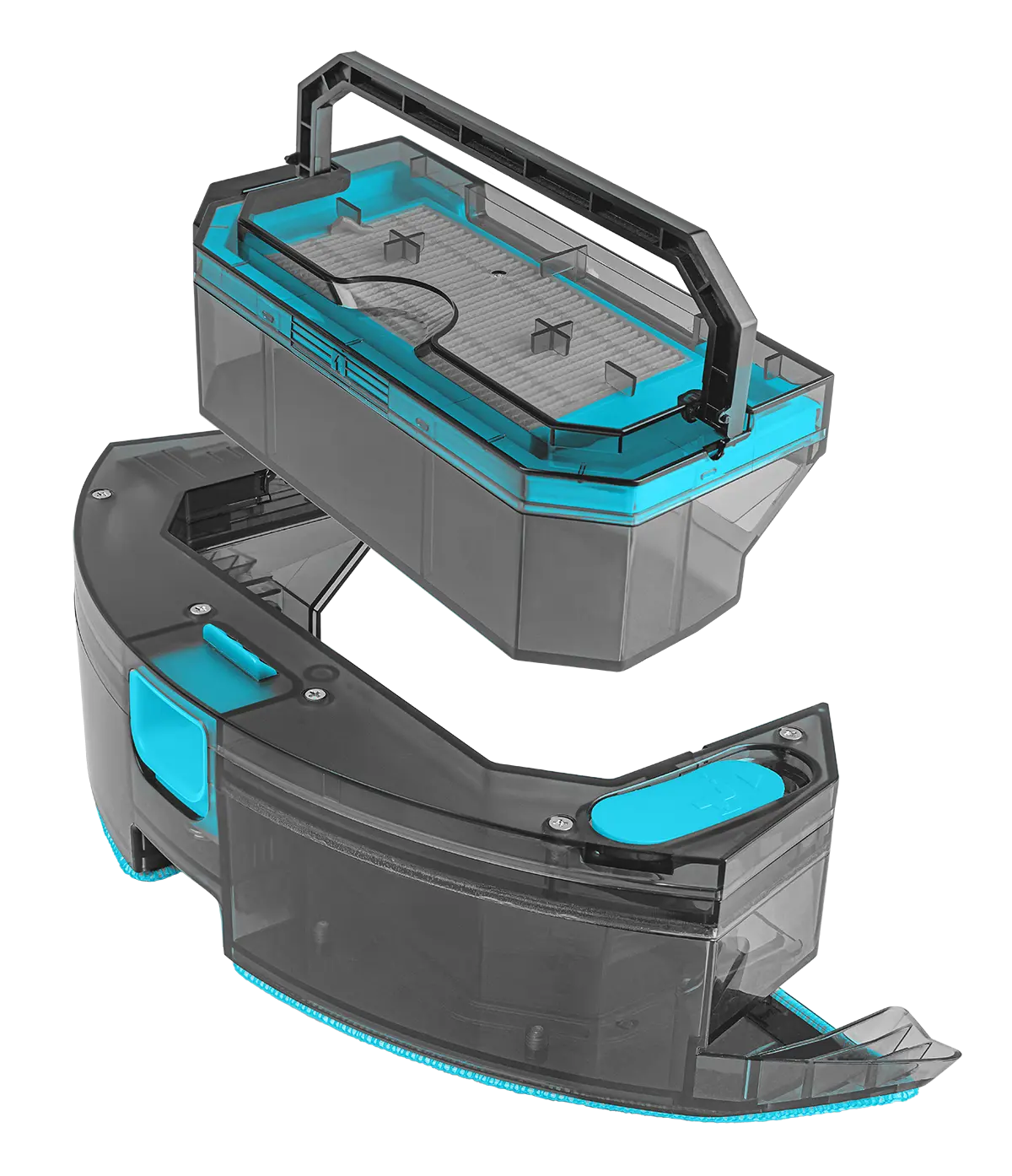 Robotický vysavač 2 v 1 je vybaven dvěma zásobníky, díky kterým si lehce poradí se suchým i mokrým úklidem. První zásobník s kapacitou 600 ml slouží pro klasický úklid na sucho. Nasadíte-li druhý zásobník 2 v 1, můžete vysávat i vytírat najednou. Kombinuje totiž klasickou nádobu na prach s elektronicky řízeným zásobníkem na vodu, takže v rekordním čase docílíte dvou úklidů najednou. Průtok vody můžete pomocí aplikace nastavit na nízkou, standardní nebo vysokou úroveň podle míry znečištění. Zásobník na vytírání je osazen textilií z mikrovlákna, která na sebe váže nečistoty a během úklidu podlahu také vyleští. Textilii lze lehce sundat a vyprat v pračce.