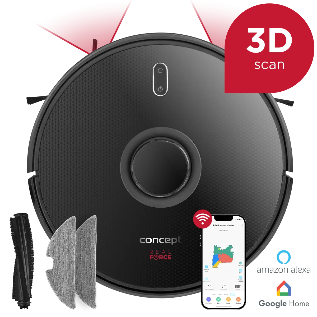 3D robotický vysavač Concept VR3400 podporuje ovládání prostřednictvím hlasového asistenta Amazon Alexa nebo Google Home. Můžete ho tedy zapojit do své chytré domácnosti a ovládat hlasovými povely.