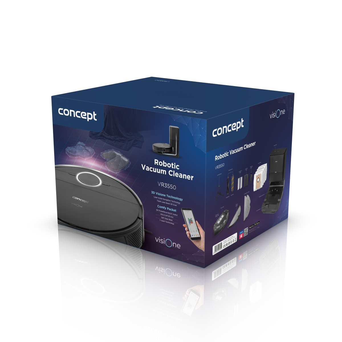 <b><p>Zánovní produkt je minimálně či jen krátkodobě používaný. Výrobek je v pořádku, může jevit známky použití. Na zboží se vztahuje plná záruka 24 měsíců. Na tuto položku se nevztahují slevové akce a dárky. </p> </b> Robotický vysavač s mopem visiOne 3D Concept VR3550 s trojrozměrným rozpoznáním předmětů vyniká perfektní orientací v prostoru, extra výkonem 8000 Pa, nízkou výškou 8,5 cm, tichým chodem a maximální samostatností. Ovládnete ho pomocí mobilní aplikace Concept Home (v češtině), nebo přes hlasového asistenta. Precizně a rychle zmapuje i velké prostory a je vhodný i pro vícepatrové domácnosti.