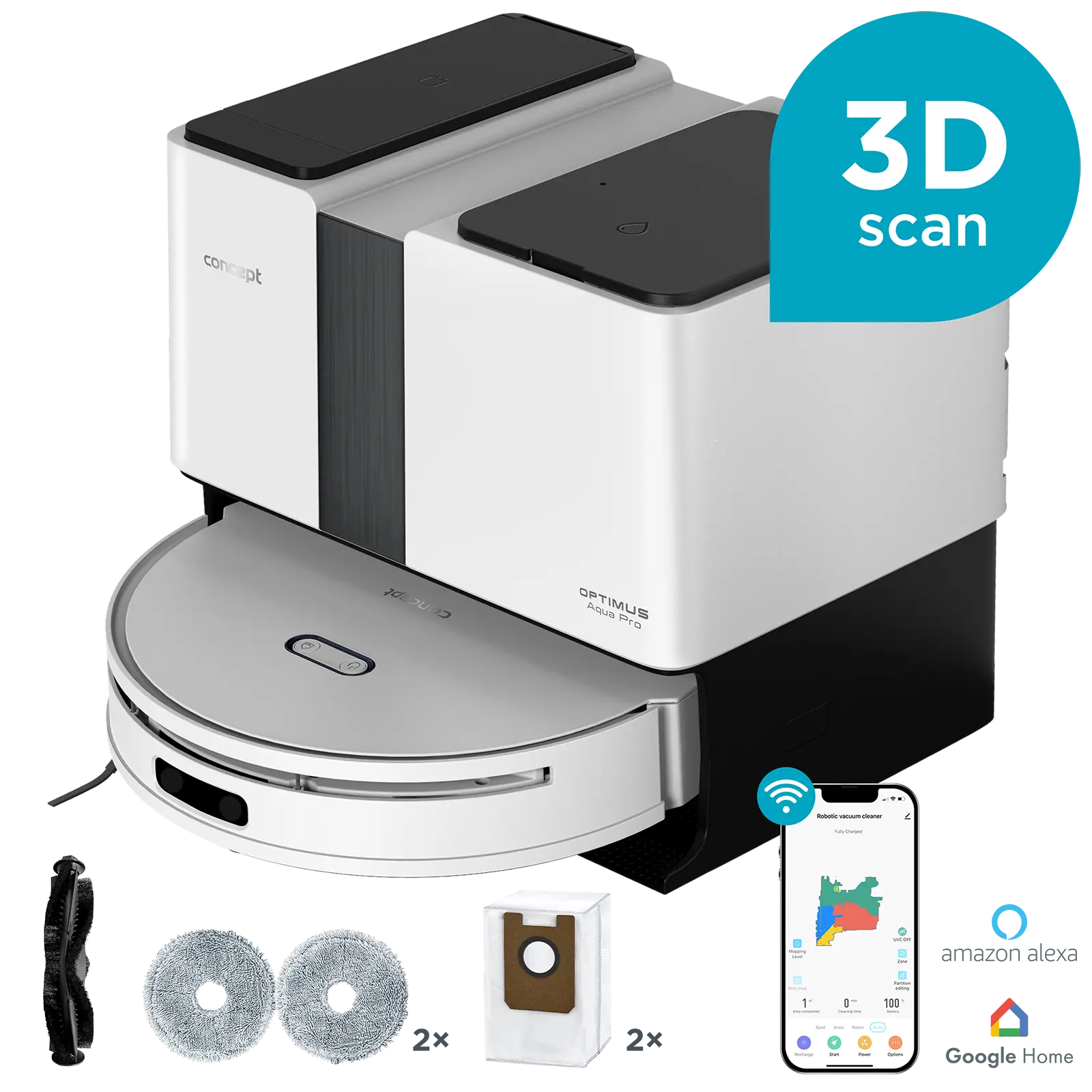 <b><p>Zánovní produkt je minimálně či jen krátkodobě používaný. Výrobek je v pořádku, může jevit známky použití. Na zboží se vztahuje plná záruka 24 měsíců. Na tuto položku se nevztahují slevové akce a dárky. </p> </b> Robotický vysavač s mopem 2v1 Aqua Pro Laser 3D Optimus Concept VR4050 s trojrozměrným rozpoznáním předmětů vyniká perfektní orientací v prostoru, výkonem 5000 Pa a automatickou detekcí koberců. Je vybaven chytrou základnou s automatickým vysypáváním prachu, dávkováním vody a praním a sušením mopů. Ovládnete ho pomocí mobilní aplikace Concept Home (v češtině) nebo přes hlasového asistenta.