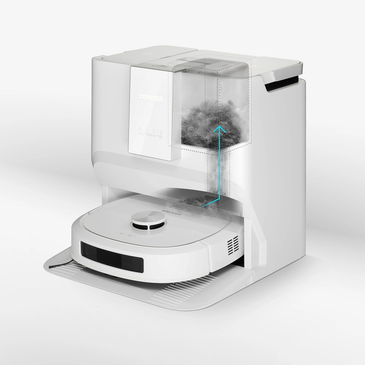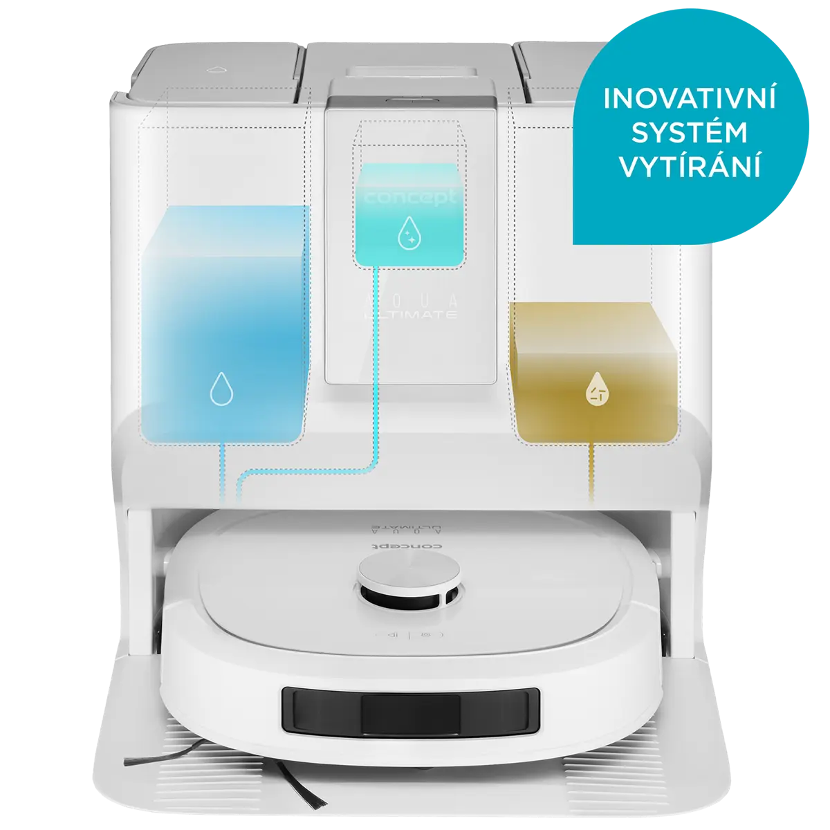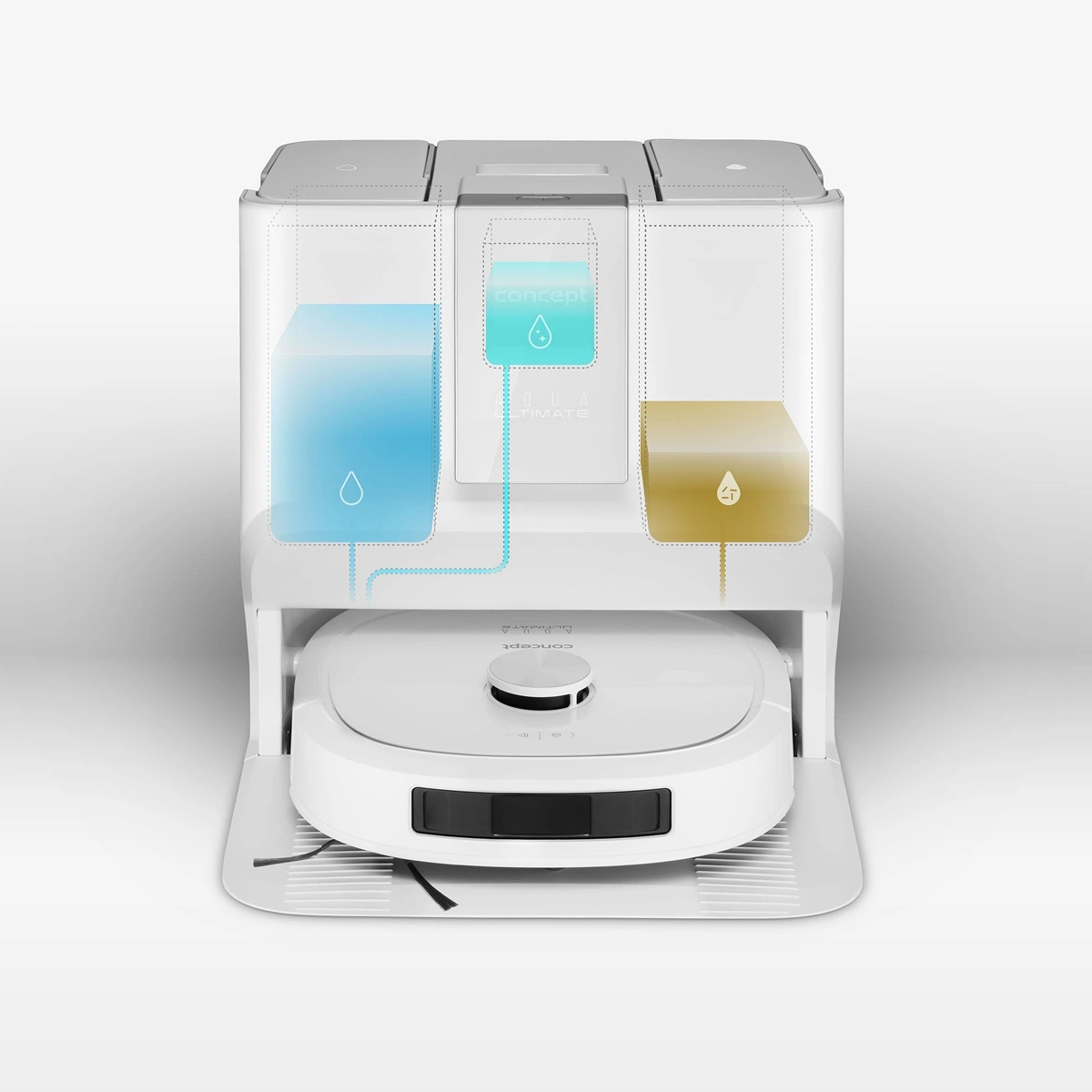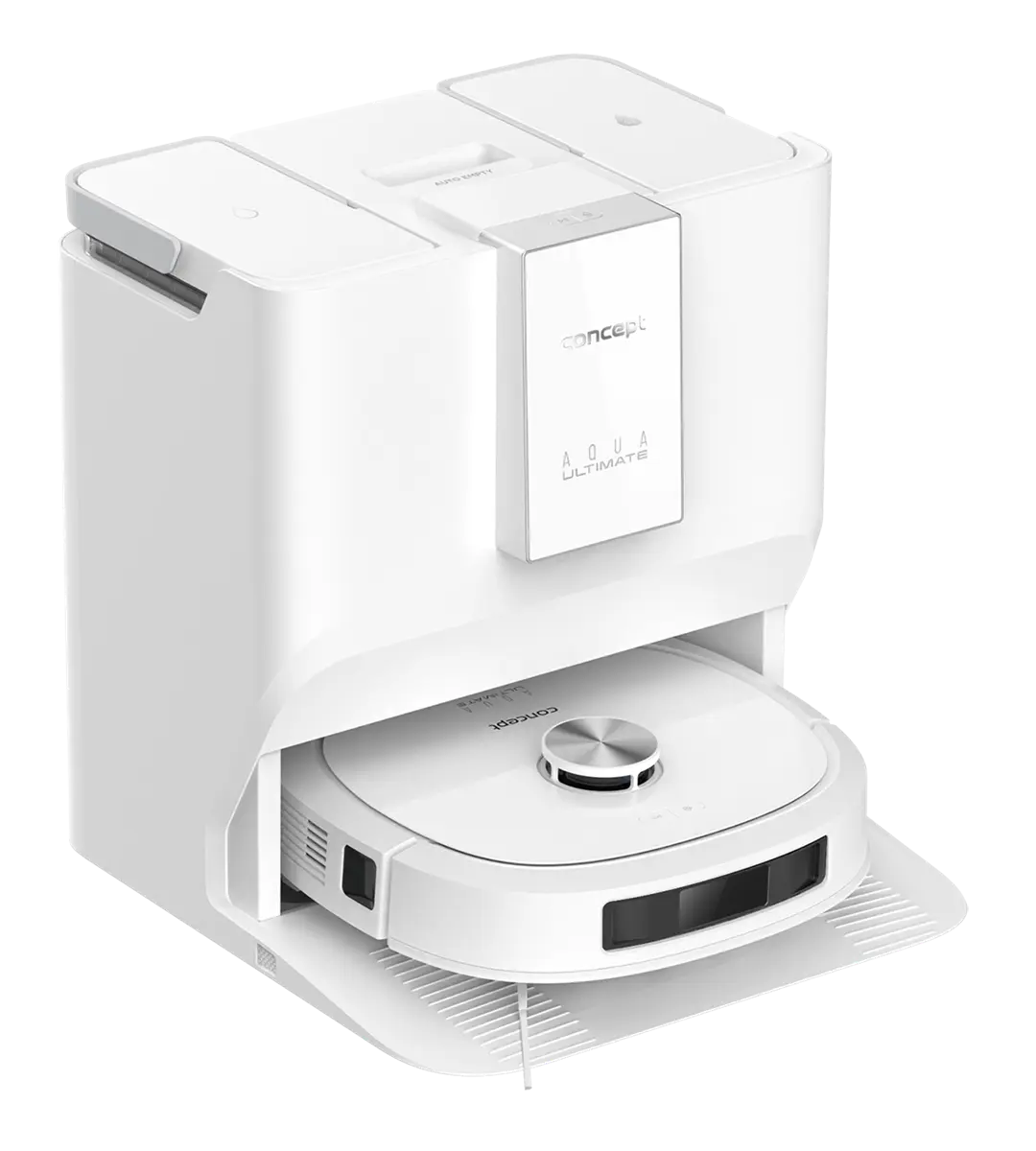 Multifunkční dokovací stanice robotického vysavače a podlahové myčky Concept VR4130 je navržena tak, aby zajistila maximální samostatnost, hygienu a pohodlí při každodenním úklidu. Díky dvěma 3,5litrovým nádržím na čistou i špinavou vodu, zásobníku na čisticí prostředek a uzavíratelnému sáčku na prach dokáže robot dlouhodobě pracovat bez vaší asistence. Před úklidem si automaticky nabere čistou vodu s čističem a když mu během práce dojde, jednoduše si ji doplní. Po skončení úklidu vysype nečistoty z vysávání přímo do prachového sáčku ve stanici, odčerpá špinavou vodu, vypere mop a vysuší ho horkým vzduchem, takže je robot neustále připraven na další úklid. Pro udržení čistoty stanice lze kdykoli spustit samočisticí režim. Zásobník na čisticí prostředek o objemu 300 ml vystačí na 50–60 dávek. Robot můžete používat i bez zásobníku na čistič, v takovém případě však bude vytírat pouze čistou vodou.