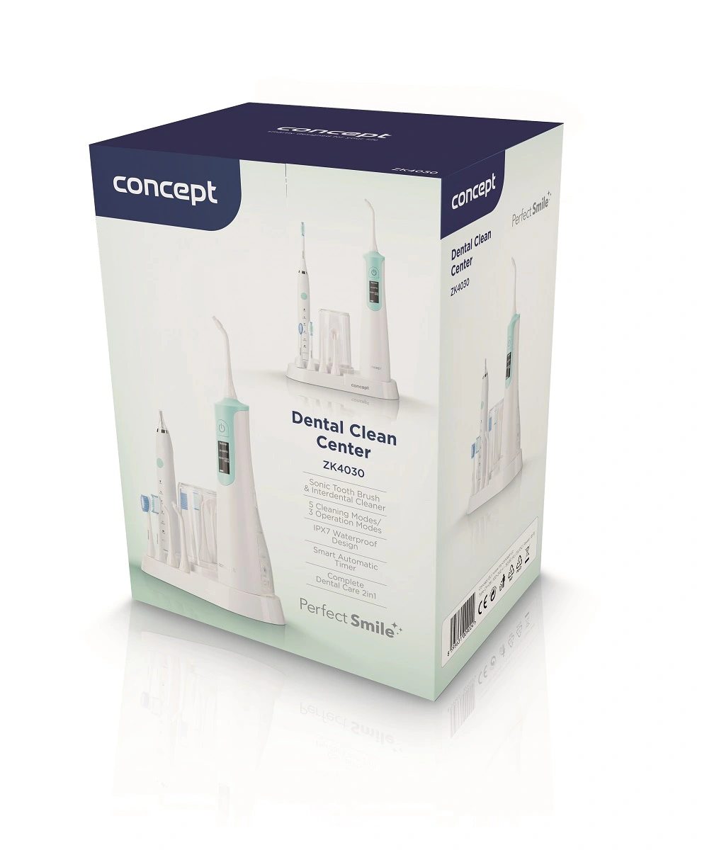 Dentální centrum Concept ZK4030 zajistí komplexní péči o zuby a dásně. Díky kombinaci sonického zubního kartáčku a přístroje pro čištění mezizubních prostor budete mít vše, co ke své každodenní ústní hygieně potřebujete.