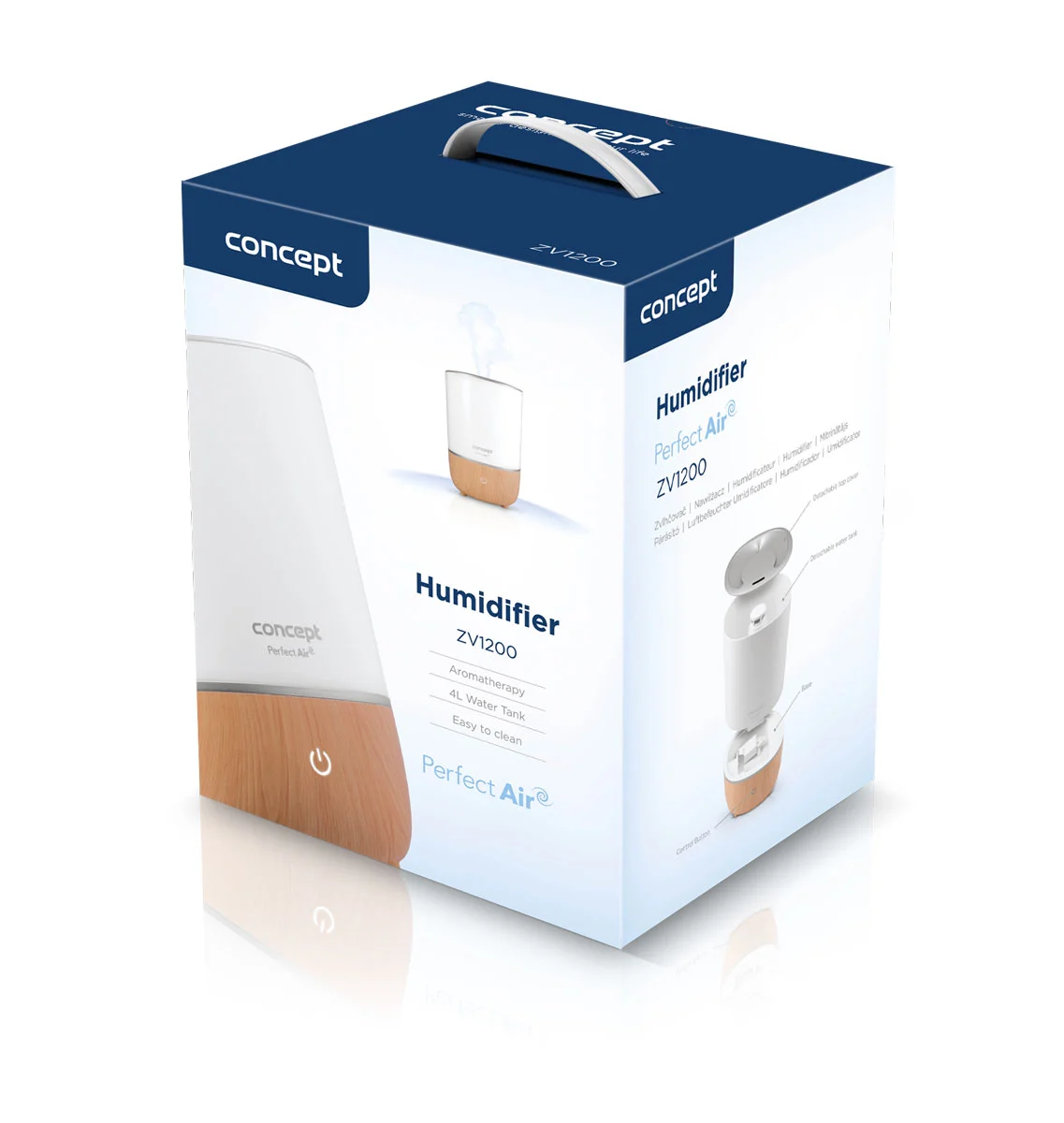 Zvlhčovač vzduchu ZV1200 z řady Perfect Air je spojením zvlhčovače a aroma difuzéru. Je vhodný do místností o velikosti až 30 m². Nabízí 3 úrovně intenzity páry s maximálním výkonem 260 ml/h. Disponuje zásobníkem na vodu o objemu 4 l, který dokáže vytvářet jemnou páru po dobu až 26 h. Při nedostatku vody se přístroj automaticky vypne.